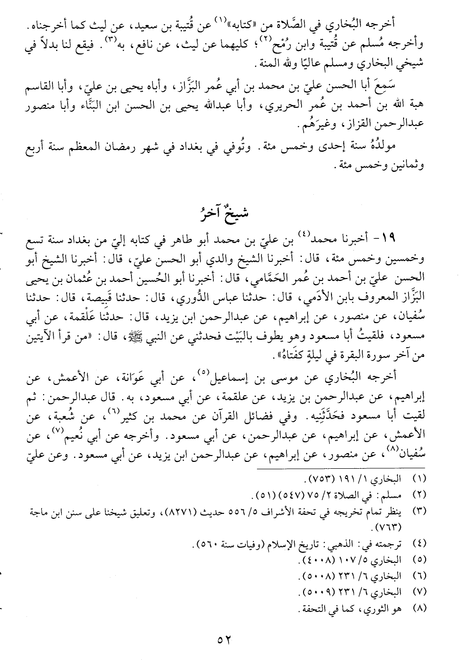 19 - أَخْبَرَنَا مُحَمَّدُ بْنُ عَلِيِّ بْنِ مُحَمَّدٍ أَبُو طَاهِرٍ، فِي كِتَابِهِ إِلَيَّ مِنْ بَغْدَادَ، سَنَةَ تِسْعٍ وَخَمْسِينَ وَخَمْسِ مِائَةٍ، أَخْبَرَنَا الشَّيْخُ وَالِدِي أَبُو الْحَسَنِ عَلِيٌّ، أَخْبَرَنَا الشَّيْخُ أَبُو الْحَسَنِ عَلِيُّ بْنُ أَحْمَدَ بْنِ عُمَرَ الْحَمَّامِيُّ، أَخْبَرَنَا أَبُو الْحَسَنِ أَحْمَدُ بْنُ عُثْمَانَ بْنِ يَحْيَى الْبَزَّازُ، الْمَعْرُوفُ بِابْنِ الأَدَمِيِّ، حَدَّثَنَا عَبَّاسٌ الدُّورِيُّ، حَدَّثَنَا قَبِيصَةُ، حَدَّثَنَا سُفْيَانُ، عَنْ مَنْصُورٍ، عَنْ إِبْرَاهِيمَ، عَنْ عَبْدِ الرَّحْمَنِ بْنِ يَزِيدَ، حَدَّثَنَا عَلْقَمَةُ، عَنْ أَبِي مَسْعُودٍ، فَلَقِيتُ أَبَا مَسْعُودٍ وَهُوَ يَطُوفُ بِالْبَيْتِ، فَحَدَّثَنِي عَنِ النَّبِيِّ صَلَّى اللَّهُ عَلَيْهِ وَسَلَّمَ، قَالَ: «مَنْ قَرَأَ الآيَتَيْنِ مِنْ آخِرِ سُورَةِ الْبَقَرَةِ فِي لَيْلَةٍ كَفَتَاهُ» ، أَخْرَجَهُ الْبُخَارِيُّ، عَنْ مُوسَى بْنِ إِسْمَاعِيلَ، عَنْ أَبِي عَوَانَةَ، عَنِ الأَعْمَشِ، عَنْ إِبْرَاهِيمَ، عَنْ عَبْدِ الرَّحْمَنِ بْنِ يَزِيدَ، عَنْ عَلْقَمَةَ، عَنْ أَبِي مَسْعُودٍ بِهِ، قَالَ عَبْدُ الرَّحْمَنِ: ثُمَّ لَقِيتُ أَبَا مَسْعُودٍ فَحَدَّثَنِيهِ.