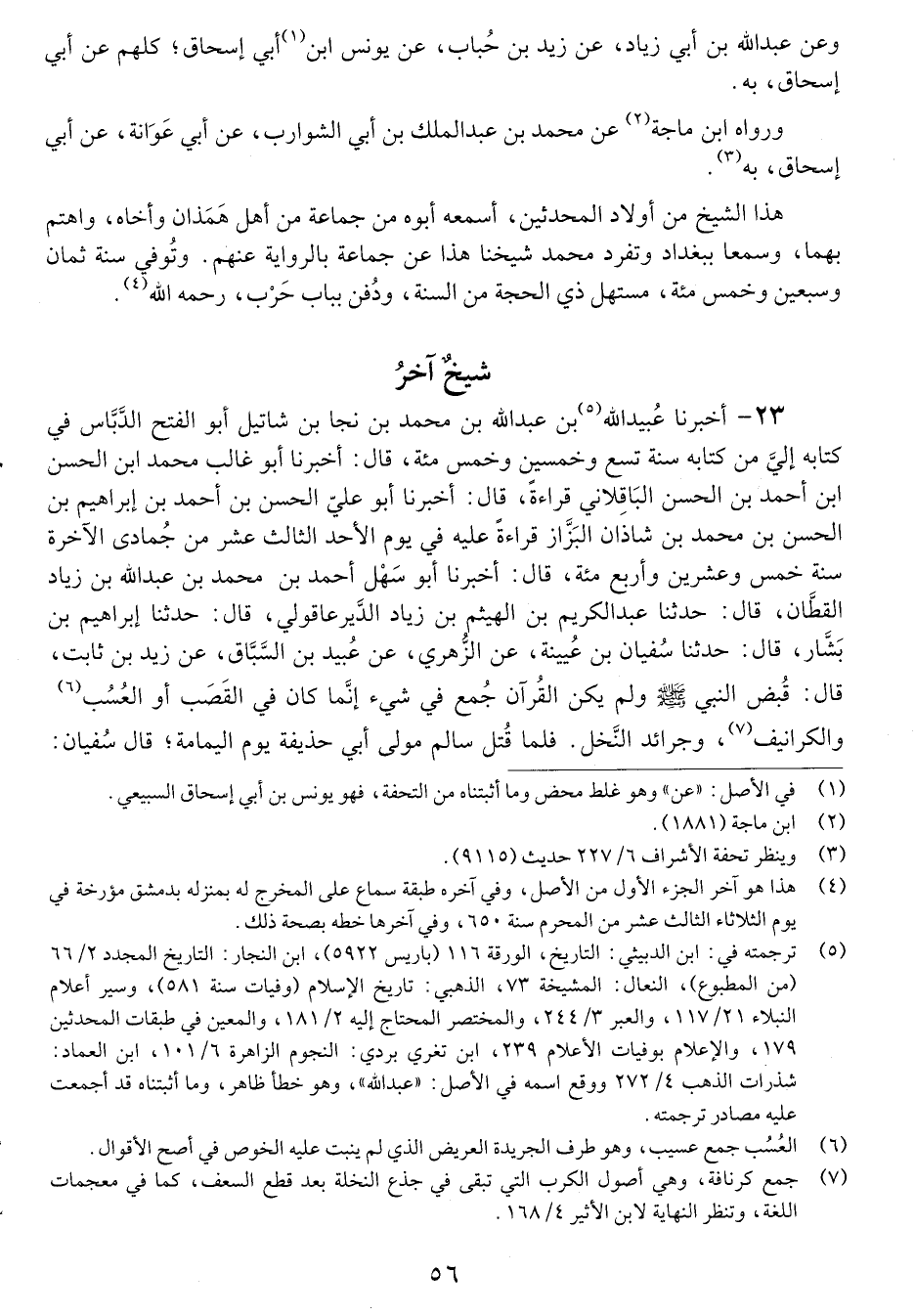 23 - أَخْبَرَنَا عُبَيْدُ اللَّهِ بْنُ عَبْدِ اللَّهِ بْنِ مُحَمَّدِ بْنِ نَجَا بْنِ شَاتِيلَ أَبُو الْفَتْحُ الدَّبَّاسُ، فِي كِتَابِهِ إِلَيَّ، مِنْ كِتَابِهِ سَنَةَ تِسْعٍ وَخَمْسِينَ وَخَمْسِ مِائَةٍ، أَخْبَرَنَا أَبُو غَالِبٍ مُحَمَّدُ بْنُ الْحَسَنِ بْنِ أَحْمَدَ بْنِ الْحَسَنِ الْبَاقِلانِيُّ، قِرَاءَةً، أَخْبَرَنَا أَبُو عَلِيٍّ الْحَسَنُ بْنُ أَحْمَدَ بْنِ إِبْرَاهِيمَ بْنِ الْحَسَنِ بْنِ مُحَمَّدِ بْنِ شَاذَانَ الْبَزَّازُ قِرَاءَةً عَلَيْهِ، فِي يَوْمِ الأَحَدِ الثَّالِثَ عَشَرَ مِنْ جُمَادَى الآخِرَةِ، سَنَةَ خَمْسٍ وَعِشْرِينَ وَأَرْبَعِ مِائَةٍ، أَخْبَرَنَا أَبُو سَهْلٍ أَحْمَدُ بْنُ مُحَمَّدِ بْنِ عَبْدِ اللَّهِ بْنِ زَادٍ الْقَطَّانُ، حَدَّثَنَا عَبْدُ الْكَرِيمِ بْنُ الْهَيْثَمِ بْنِ زِيَادٍ الدَّيْرَعَاقُولِيُّ، حَدَّثَنَا إِبْرَاهِيمُ بْنُ بَشَّارٍ، حَدَّثَنَا سُفْيَانُ بْنُ عُيَيْنَةَ، عَنِ الزُّهْرِيِّ، عَنْ عُبَيْدِ اللَّهِ بْنِ السَّبَّاقِ، عَنْ زَيْدِ بْنِ ثَابِتٍ، قَالَ: قُبِضَ النَّبِيُّ صَلَّى اللَّهُ عَلَيْهِ وَسَلَّمَ، وَلَمْ يَكُنِ الْقُرْآنُ جُمِعَ فِي شَيْءٍ، إِنَّمَا كَانَ فِي الْعَصْبِ، أَوِ الْعَسْبِ، وَالْكَرَانِيفِ، وَجَرَائِدِ النَّخْلِ، فَلَمَّا قُتِلَ سَالِمٌ مَوْلَى أَبِي حُذَيْفَةَ يَوْمَ الْيَمَامَةِ، قَالَ سُفْيَانُ: