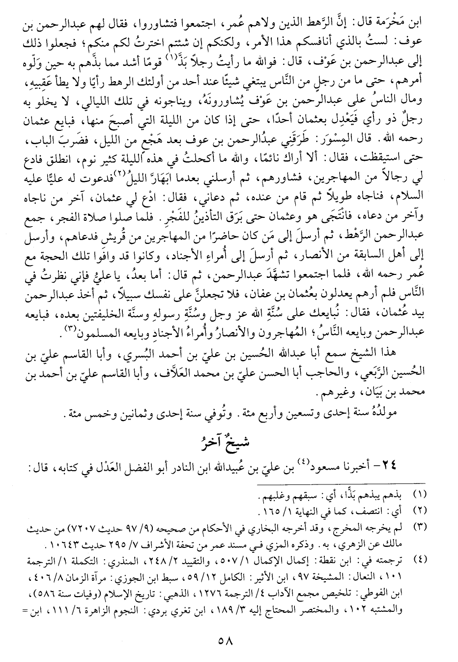 قَالَ الْمِسْوُرَ: طَرَقَنِي عَبْدُ الرَّحْمَنِ بْنُ عَوْفٍ بَعْدَ هَجْعٍ مِنَ اللَّيْلَةِ، فَضَرَبَ الْبَابَ، حَتَّى اسْتَيْقَظْتُ، فَقَالَ: أَلا أَرَاكَ نَائِمًا، وَاللَّهِ مَا اكْتَحَلْتُ فِي هَذِهِ اللَّيْلَةِ كَثِيرَ نَوْمٍ، انْطَلِقْ فَادْعُ لِي رِجَالا مِنَ الْمُهَاجِرِينَ، فَشَاوِرْهُمْ، ثُمَّ أَرْسِلْنِي بَعْدمَا ابْهَارَّ اللَّيْلُ، فَدَعَوْتُ لَهُ عَلِيًّا، عَلَيْهِ السَّلامُ، فَنَاجَاهُ طَوِيلا، ثُمَّ قَامَ مِنْ عِنْدِهِ، ثُمَّ دَعَانِي، فَقَالَ: ادْعُ لِي عُثْمَانَ، آخِرُ مَنْ نَاجَاهُ وَآخِرُ مَنْ دَعَاهُ، فَتَنَاجَى هُوَ وَعُثْمَانُ، حَتَّى بَرِقَ الْمُنَادِينَ لِلْفَجْرِ، فَلَمَّا صَلَّوْا صَلاةَ الْفَجْرِ، جَمَعَ عَبْدُ الرَّحْمَنِ الرَّهْطَ، ثُمَّ أَرْسَلَ إِلَى مَنْ كَانَ حَاضِرًا مِنَ الْمُهَاجِرِينَ مِنْ قُرَيْشٍ فَدَعَاهُمْ وَأَرْسَلَ إِلَى أَهْلِ السَّابِقَةِ مِنَ الأَنْصَارِ، ثُمَّ أَرْسَلَ أُمَرَاءَ الأَجْنَادِ، وَكَانُوا قَدْ وَافَوْا تِلْكَ الْحَجَّةَ مَعَ عُمَرَ، رَحِمَهُ اللَّهُ، فَلَمَّا اجْتَمَعُوا تَشَهَّدَ عَبْدُ الرَّحْمَنِ، ثُمَّ قَالَ: أَمَّا بَعْدُ، يَا عَلِيُّ، فَإِنِّي نَظَرْتُ فِي النَّاسِ فَلَمْ أَرَهُمْ يَعْدِلُونَ بِعُثْمَانَ بْنِ عَفَّانَ، فَلا تجَعَلَنَّ عَلَى نَفْسِكَ سَبِيلا، ثُمَّ أَخَذَ عَبْدُ الرَّحْمَنِ بِيَدِ عُثمَانَ، فَقَالَ: نُبَايِعُكَ عَلَى سُنَّةِ اللَّهِ، عَزَّ وَجَلَّ، وَسُنَّةِ رَسُولِهِ، وَسُنَّةِ الْخَلِيفَتَيْنِ بَعْدَهُ، فَبَايَعَهُ عَبْدُ الرَّحْمَنِ، وَبَايَعَهُ النَّاسُ الْمُهَاجِرُونَ وَالأَنْصَارُ وَأُمَرَاءُ الأَجْنَادِ وَبَايَعَهُ الْمُسْلِمُونَ