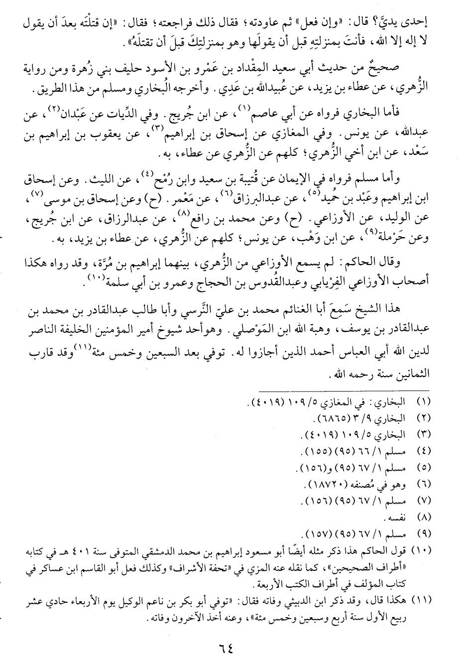 إِحْدَى يَدَيَّ؟ قَالَ: وَإِنْ فَعَلَ، ثُمَّ عَاوَدْتُهُ، فَقَالَ ذَلِكَ، فَرَاجَعْتُهُ، فَقَالَ: «إِنْ قَتَلْتَهُ بَعْدَ أَنْ يَقُولَ لا إِلَهَ إِلا اللَّهُ، فَأَنْتَ بِمَنْزِلَتِهِ قَبْلَ أَنْ يَقُولَهَا , وَهُوَ بِمَنْزِلَتِكَ قَبْلَ أَنْ تَقْتُلَهُ» ، صَحِيحٌ مِنْ حَدِيثِ أَبِي سَعِيدٍ الْمِقْدَادِ بْنِ عَمْرِو بْنِ الأَسْوَدِ، حَلِيفِ بَنِي زُهْرَةَ، وَمِنْ رِوَايَةِ الزُّهْرِيِّ، عَنْ عَطَاءِ بْنِ يَزِيدَ، عَنْ عُبَيْدِ اللَّهِ بْنِ عَدِيٍّ.