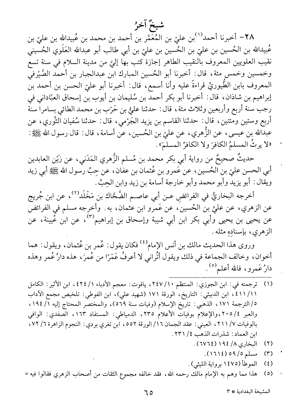 28 - أَخْبَرَنَا أَحْمَدُ بْنُ عَلِيِّ بْنِ الْمُعَمَّرِ بْنِ مُحَمَّدِ بْنِ الْمُعَمَّرِ بْنِ أَحْمَدَ بْنِ مُحَمَّدِ بْنِ عُبَيْدِ اللَّهِ بْنِ عَلِيِّ بْنِ عُبَيْدِ اللَّهِ بْنِ عَلِيِّ بْنِ عُبَيْدِ اللَّهِ بْنِ الْحُسَيْنِ بْنِ عَلِيِّ بْنِ الْحُسَيْنِ بْنِ عَلِيِّ بْنِ أَبِي طَالِبٍ أَبُو عَبْدِ اللَّهِ الْعَلَوِيُّ الْحُسَيْنِيُّ نَقِيبُ الْعَلَوِيِّينَ، الْمَعْرُوفُ بِالنَّقِيبِ الطَّاهِرِ، إِجَازَةً، كَتَبَ بِهَا إِلَيَّ مِنْ مَدِينَةِ السَّلامِ فِي سَنَةِ تِسْعٍ وَخَمْسِينَ وَخَمْسِ مِائَةٍ، أَخْبَرَنَا أَبُو الْحُسَيْنِ الْمُبَارَكُ بْنُ عَبْدِ الْجَبَّارِ بْنِ أَحْمَدَ الصَّيْرَفِيُّ، الْمَعْرُوفُ بِابْنِ الطُّيُورِيِّ، قِرَاءَةً عَلَيْهِ وَأَنَا أَسْمَعُ، أَخْبَرَنَا أَبُو عَلِيٍّ الْحَسَنُ بْنُ أَحْمَدَ بْنِ إِبْرَاهِيمَ بْنِ شَاذَانَ، أَخْبَرَنَا أَبُو بَكْرٍ أَحْمَدُ بْنُ سُلَيْمَانَ بْنِ أَيُّوبَ بْنِ إِسْحَاقَ الْعَبَّادَانِيُّ فِي رَجَبٍ سَنَةَ أَرْبَعٍ وَأَرْبَعِينَ وَثَلاثِ مِائَةٍ، حَدَّثَنَا عَلِيُّ بْنُ حَرْبِ بْنِ مُحَمَّدٍ الطَّائِيُّ بِسَامِرَّاءَ، سَنَةَ أَرْبَعٍ وَسِتِّينَ وَمِائَتَيْنِ، حَدَّثَنَا الْقَاسِمُ بْنُ يَزِيدَ الْجَرْمِيُّ، حَدَّثَنَا سُفْيَانُ الثَّوْرِيُّ، عَنْ عَبْدِ اللَّهِ بْنِ عِيسَى، عَنِ الزُّهْرِيِّ، عَنْ عَلِيِّ بْنِ الْحُسَيْنِ، عَنْ عَمْرِو بْنِ عُثْمَانَ بْنِ عَفَّانَ، عَنْ أُسَامَةَ، قَالَ: قَالَ رَسُولُ اللَّهِ صَلَّى اللَّهُ عَلَيْهِ وَسَلَّمَ: «لا يَرِثِ الْمُسْلِمُ الْكَافِرَ، وَلا الْكَافِرُ الْمُسْلِمَ» ، حَدِيثٌ صَحِيحٌ مِنْ رِوَايَةِ أَبِي بَكْرٍ مُحَمَّدِ بْنِ مُسْلِمٍ الزُّهْرِيِّ الْمَدَنِيِّ، عَنْ زَيْنِ الْعَابِدِينَ أَبِي الْحَسَنِ عَلِيِّ بْنِ الْحُسَيْنِ، عَنْ عَمْرِو بْنِ عُثْمَانَ بْنِ عَفَّانَ، عَنْ حِبِّ رَسُولِ اللَّهِ صَلَّى اللَّهُ عَلَيْهِ وَسَلَّمَ، أَبِي زَيْدٍ، وَيُقَالُ: أَبُو يَزِيدَ، وَأَبُو مُحَمَّدٍ، وَأَبُو خَارِجَةَ أُسَامَةُ بْنُ زَيْدٍ وَابْنُ الْحِبِّ.