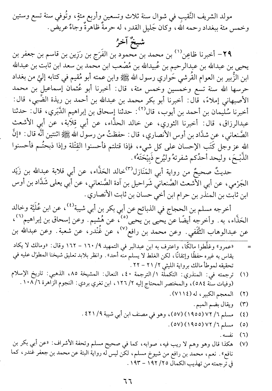 29 - أَخْبَرَنَا ظَاعِنُ بْنُ مُحَمَّدِ بْنِ مَحْمُودِ بْنِ الْفَرَجِ بْنِ رَزِينِ بْنِ قَاسِمِ بْنِ جَعْفَرِ بْنِ يَحْيَى بْنِ عَبْدِ اللَّهِ بْنِ عَبْدِ الرَّحِيمِ بْنِ عُبَيْدِ اللَّهِ بْنِ مُصْعَبِ بْنِ مُحَمَّدِ بْنِ سَعْدِ بْنِ ثَابِتِ بْنِ عَبْدِ اللَّهِ بْنِ الزُّبَيْرِ بْنِ الْعَوَّامِ الْقُرَشِيُّ حَوَارِيُّ رَسُولِ اللَّهِ صَلَّى اللَّهُ عَلَيْهِ وَسَلَّمَ، وَابْنُ عَمَّتِهِ، أَبُو مُقِيمٍ فِي كِتَابِهِ إِلَيَّ مِنْ بَغْدَادَ، حَرَسَهَا اللَّهُ، سَنَةَ تِسْعٍ وَخَمْسِينَ وَخَمْسِ مِائَةٍ، أَخْبَرَنَا أَبُو عُثْمَانَ إِسْمَاعِيلُ بْنُ مُحَمَّدٍ الأَصْبَهَانِيُّ إِمْلاءً، أَخْبَرَنَا أَبُو بَكْرٍ مُحَمَّدُ بْنُ عَبْدِ اللَّهِ بْنِ أَحْمَدَ بْنِ رِيذَةَ الضَّبِّيُّ، أَخْبَرَنَا سُلَيْمَانُ بْنُ أَحْمَدَ بْنِ أَيُّوبَ، حَدَّثَنَا إِسْحَاقُ بْنُ إِبْرَاهِيمَ الدَّبَرِيُّ، حَدَّثَنَا عَبْدُ الرَّزَّاقِ، أَخْبَرَنَا الثَّوْرِيُّ، عَنْ خَالِدٍ الْحَذَّاءِ، عَنْ أَبِي قِلابَةَ، عَنْ أَبِي الأَشْعَثِ الصَّنْعَانِيِّ، عَنْ شَدَّادِ بْنِ أَوْسٍ الأَنْصَارِيِّ، قَالَ: حَفِظْتُ مِنْ رَسُولِ اللَّهِ صَلَّى اللَّهُ عَلَيْهِ وَسَلَّمَ، اثْنَتَيْنِ، أَنَّهُ قَالَ: «إِنَّ اللَّهَ عَزَّ وَجَلَّ كَتَبَ الإِحْسَانَ عَلَى كُلِّ شَيْءٍ، فَإِذَا قَتَلْتُمْ فَأَحْسِنُوا الْقِتْلَةَ، وَإِذَا ذَبَحْتُمْ فَأَحْسِنُوا الذَّبْحَ، وَلْيُحِدَّ أَحَدُكُمْ شَفْرَتَهُ، وَلْيُرِحْ ذَبِيحَتَهُ» ، حَدِيثٌ صَحِيحٌ مِنْ رِوَايَةِ أَبِي الْمَنَازِلِ خَالِدٍ الْحَذَّاءِ، عَنْ أَبِي قِلابَةَ عَبْدِ اللَّهِ بْنِ زَيْدٍ الْجَرْمِيِّ، عَنْ أَبِي الأَشْعَثِ الصَّنْعَانِيِّ شُرَاحِيلَ بْنِ رَادَهَ الصَّنْعَانِيِّ، عَنْ أَبِي يَعْلَى شَدَّادِ بْنِ أَوْسِ بْنِ ثَابِتِ بْنِ الْمُنْذِرِ بْنِ حَرَامِ ابْنِ أَخِي حَسَّانِ بْنِ ثَابِتٍ الأَنْصَارِيِّ.