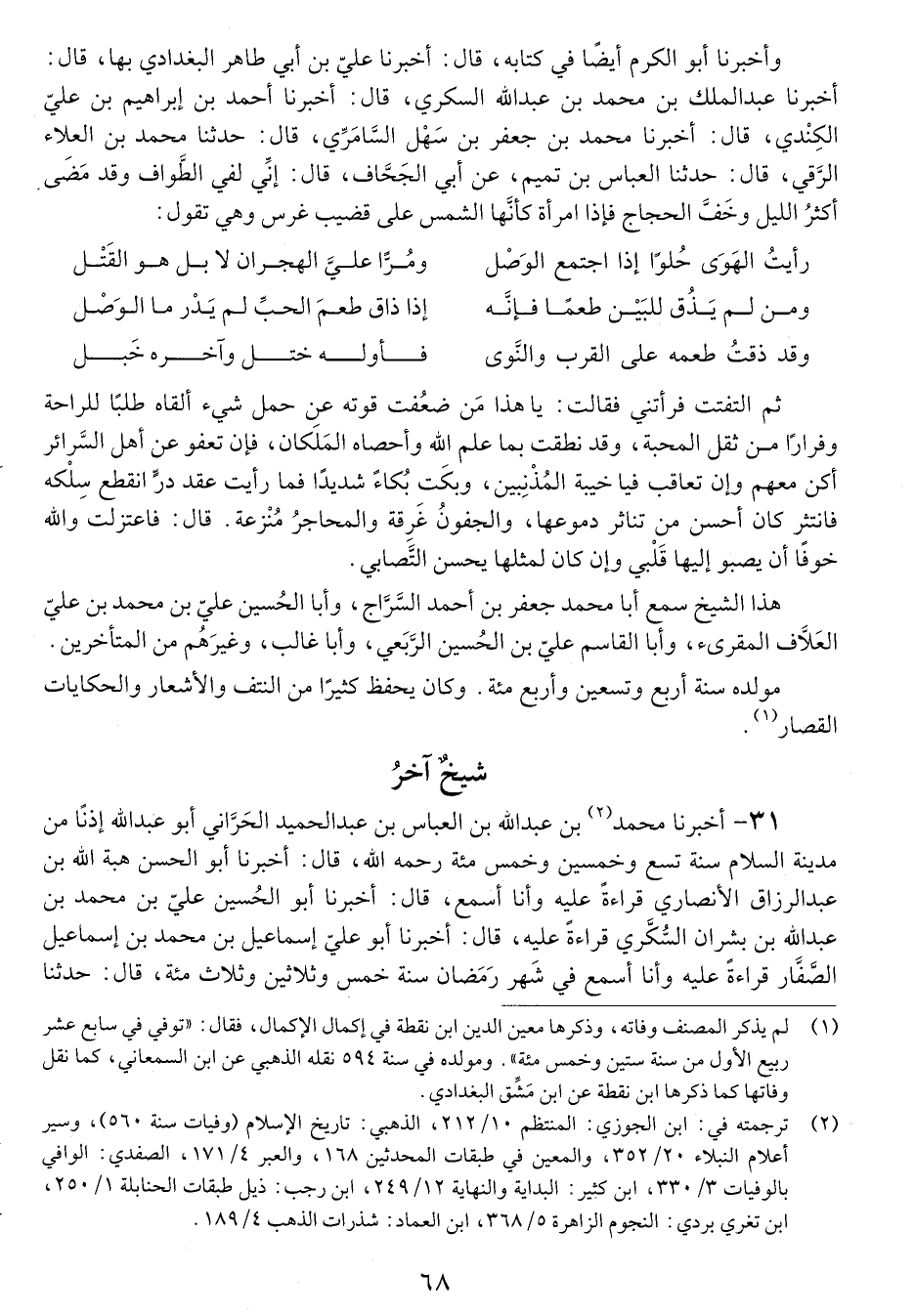 ثُمَّ الْتَفَتَتْ فَرَأَتْنِي، فَقَالَتْ: يَا هَذَا، مَنْ ضَعُفَتْ قُوَّتُهُ عَنْ حَمْلِ شَيْءٍ أَلْقَاهُ طَلَبًا لِلرَّاحَةِ، وَفِرَارًا مِنْ ثِقَلِ الْمَحَبَّةِ، وَقَدْ نَطَقْتُ بِمَا عَلِمَ اللَّهُ وَأَحْصَاهُ الْمَلَكَانِ، فَإِنْ تَعْفُ عَنْ أَهْلِ السَّرَائِرِ أَكُنْ مَعَهُمْ، وَإِنْ تُعَاقِبْ فَيَا خَيْبَةَ الْمُذْنِبِينَ، وَبَكَتْ بُكَاءً شَدِيدًا، فَمَا رَأَيْتُ عِقْدَ دُرٍّ انْقَطَعَ سِلْكُهُ فَانْتَثَرَ كَانَ أَحْسَنَ مِنْ تَنَاثُرِ دُمُوعِهَا، وَالْجُفُونُ غَرِقَةٌ، وَالْمَحَاجِرُ مُتْرَعَةٌ، قَالَ: فَاعْتَزَلْتُ وَاللَّهِ خَوْفًا أَنْ يَصْبُوَ إِلَيْهَا قَلْبِي، وَإِنْ كَانَ بِمِثْلِهَا يَحْسُنُ التَّصَابِي هَذَا الشَّيْخُ سَمِعَ أَبَا مُحَمَّدٍ جَعْفَرَ بْنَ أَحْمَدَ السَّرَّاجَ، وَأَبَا الْحُسَيْنِ عَلِيَّ بْنَ مُحَمَّدِ بْنِ عَلِيِّ بْنِ الْعَلافِ الْمُقْرِئَ، وَأَبَا الْقَاسِمِ عَلِيَّ بْنَ الْحُسَيْنِ الرَّبَعِيَّ، وَأَبَا غَالِبٍ، وَغَيْرَهُمْ مِنَ الْمُتَأَخِّرِينَ، مَوْلِدُهُ سَنَةَ أَرْبَعٍ وَتِسْعِينَ وَأَرْبَعِ مِائَةٍ، وَكَانَ يَحْفَظُ كَثِيرًا مِنَ النُّتَفِ وَالأَشْعَارِ وَالْحِكَايَاتِ الْقِصَارِ.