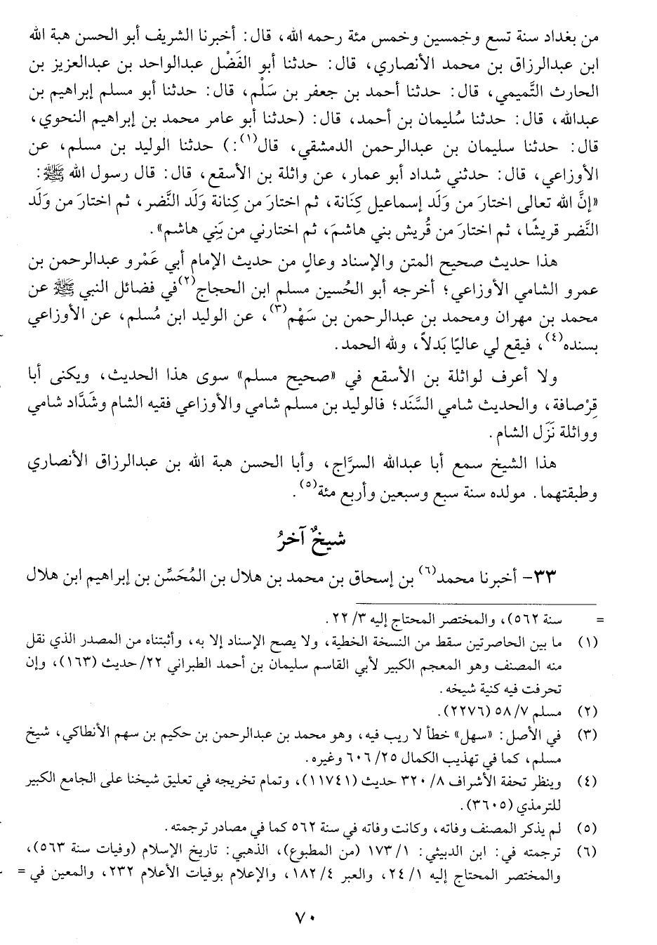 مِنْ بَغْدَادَ، سَنَةَ تِسْعٍ وَخَمْسِينَ وَخَمْسِ مِائَةٍ، رَحِمَهُ اللَّهُ، أَخْبَرَنَا الشَّرِيفُ أَبُو الْحُسَيْنِ هِبَةُ اللَّهِ بْنُ عَبْدِ الرَّزَّاقِ بْنِ مُحَمَّدٍ الأَنْصَارِيُّ، حَدَّثَنَا أَبُو الْفَضْلِ عَبْدُ الْوَاحِدِ بْنُ عَبْدِ الْعَزِيزِ بْنِ الْحَارِثِ التَّمِيمِيُّ، حَدَّثَنَا أَحْمَدُ بْنُ جَعْفَرِ بْنِ سَلْمٍ، حَدَّثَنَا أَبُو مُسْلِمٍ إِبْرَاهِيمُ بْنُ عَبْدِ اللَّهِ، حَدَّثَنَا سُلَيْمَانُ بْنُ أَحْمَدَ، حَدَّثَنَا الْوَلِيدُ بْنُ مُسْلِمٍ، عَنِ الأَوْزَاعِيِّ، حَدَّثَنِي شَدَّادٌ أَبُو عَمَّارٍ، عَنْ وَاثِلَةَ بْنِ الأَسْقَعِ، قَالَ: قَالَ رَسُولُ اللَّهِ صَلَّى اللَّهُ عَلَيْهِ وَسَلَّمَ: «إِنَّ اللَّهَ تَعَالَى اخْتَارَ مِنْ وَلَدِ إِسْمَاعِيلَ كِنَانَةَ، ثُمَّ اخْتَارَ مِنْ كِنَانَةَ وَلَدَ النَّضْرِ، ثُمَّ اخْتَارَ مِنْ وَلَدِ النَّضْرِ قُرَيْشًا، ثُمَّ اخْتَارَ مِنْ قُرَيْشٍ بَنِي هَاشِمٍ، ثُمَّ اخْتَارَنِي مِنْ بَنِي هَاشِمٍ» ، هَذَا حَدِيثٌ صَحِيحُ الْمَتْنِ وَالإِسْنَادِ وَعَالٍ، مِنْ حَدِيثِ الإِمَامِ أَبِي عَمْرٍو عَبْدِ الرَّحْمَنِ بْنِ عَمْرٍو الشَّامِيِّ الأَوْزَاعِيِّ.