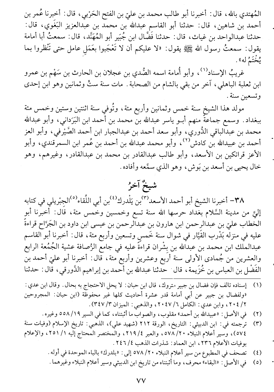 الْمُهْتَدِي بِاللَّهِ، أَخْبَرَنَا أَبُو طَالِبٍ مُحَمَّدُ بْنُ عَلِيِّ بْنِ الْفَتْحِ الْحَرْبِيُّ، أَخْبَرَنَا عُمَرُ بْنُ أَحْمَدَ بْنِ شَاهِينَ، حَدَّثَنَا أَبُو الْقَاسِمِ عَبْدُ اللَّهِ بْنُ مُحَمَّدِ بْنِ عَبْدِ الْعَزِيزِ الْبَغَوِيُّ، حَدَّثَنَا عَبْدُ الْوَاحِدِ بْنُ غِيَاثٍ، حَدَّثَنَا فَضَالُ بْنُ جُبَيْرٍ أَبُو الْمُهَنَّدِ، قَالَ: سَمِعْتُ أَبَا أُمَامَةَ، يَقُولُ: سَمِعْتُ رَسُولَ اللَّهِ صَلَّى اللَّهُ عَلَيْهِ وَسَلَّمَ، يَقُولُ: «لا عَلَيْكُمْ أَنْ لا تُعْجَبُوا بِعَمَلِ عَامِلٍ حَتَّى تَنْظُرُوا بِمَا يُخْتَمُ لَهُ» ، غَرِيبُ الإِسْنَادِ، وَأَبُو أُمَامَةَ اسْمُهُ: الصَّدِيُّ بْنُ عَجْلانَ بْنِ الْحَارِثِ بْنِ سَهْمِ بْنِ عَمْرِو بْنِ ثَعْلَبَةَ الْبَاهِلِيُّ، آخِرُ مَنْ بَقِيَ بِالشَّامِ مِنَ الصَّحَابَةِ، مَاتَ سَنَةَ سِتٍّ وَثَمَانِينَ، وَهُوَ ابْنُ إِحْدَى وَتِسْعِينَ سَنَةً