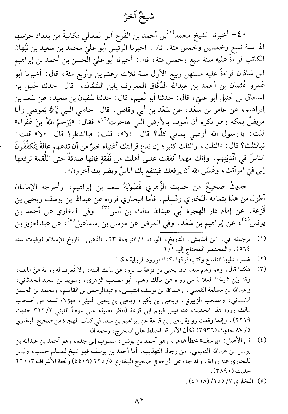 40 - أَخْبَرَنَا الشَّيْخُ مُحَمَّدُ بْنُ أَحْمَدَ بْنِ الْفَرَجِ أَبُو الْمَعَالِي، مُكَاتَبَةً، مِنْ بَغْدَادَ، حَرَسَهَا اللَّهُ، سَنَةَ تِسْعٍ وَخَمْسِينَ وَخَمْسِ مِائَةٍ، أَخْبَرَنَا الرَّئِيسُ أَبُو عَلِيٍّ مُحَمَّدُ بْنُ سَعِيدِ بْنِ نَبْهَانَ الْكَاتِبُ، قِرَاءَةً عَلَيْهِ، سَنَةَ سَبْعٍ وَخَمْسِ مِائَةٍ، أَخْبَرَنَا أَبُو عَلِيٍّ الْحَسَنُ بْنُ مُحَمَّدِ بْنِ إِبْرَاهِيمَ بْنِ شَاذَانَ، قِرَاءَةً عَلَيْهِ، مُسْتَهَلَّ رَبِيعٍ الأَوَّلِ سَنَةَ ثَلاثٍ وَعِشْرِينَ وَأَرْبَعِ مِائَةٍ، أَخْبَرَنَا أَبُو عَمْرٍو عُثْمَانُ بْنُ أَحْمَدَ بْنِ عَبْدِ اللَّهِ الدَّقَّاقُ الْمَعْرُوفُ بِابْنِ السَّمَّاكِ، حَدَّثَنَا حَنْبَلُ بْنُ إِسْحَاقَ بْنِ حَنْبَلٍ أَبُو عَلِيٍّ، حَدَّثَنَا أَبُو نُعَيْمٍ، حَدَّثَنَا سُفْيَانُ بْنُ سَعِيدٍ، عَنْ سَعْدِ بْنِ إِبْرَاهِيمَ، عَنْ عَامِرِ بْنِ سَعْدٍ، عَنْ سَعْدِ بْنِ أَبِي وَقَّاصٍ، قَالَ: جَاءَنِي النَّبِيُّ صَلَّى اللَّهُ عَلَيْهِ وَسَلَّمَ، يَعُودُنِي وَأَنَا مَرِيضٌ بِمَكَّةَ، وَهُوَ يَكْرَهُ أَنْ أَمُوتَ بِالأَرْضِ الَّتِي هَاجَرْتُ، فَقَالَ: يَرْحَمُ اللَّهُ ابْنَ عَفْرَاءَ، قُلْتُ: يَا رَسُولَ اللَّهِ، أُوصِي بِمَالِي كُلِّهِ؟ قَالَ: لا، قُلْتُ: فَبِالشَّطْرِ؟ قَالَ: لا، قَالَ: فَبِالثُّلُثِ؟ قَالَ: «الثُّلُثُ، وَالثُّلُثُ كَثِيرٌ، إِنْ تَدَعْ قَرَابَتَكَ أَغْنِيَاءَ خَيْرٌ مِنْ أَنْ تَدَعَهُمْ عَالَةً يَتَكَفَّفُونَ النَّاسَ فِي أَنْدِيَتِهِمْ، وَإِنَّكَ مَهْمَا أَنْفَقْتَ عَلَى أَهْلِكَ مِنْ نَفَقَةٍ فَإِنَّهَا صَدَقَةٌ، حَتَّى اللُّقْمَةَ تَرْفَعُهَا إِلَى فِي امْرَأَتِكَ، وَعَسَى اللَّهُ أَنْ يَرْفَعَكَ فَيَنْتَفِعَ بِكَ أُنَاسٌ وَيُضَرُّ بِكَ آخَرُونَ» .