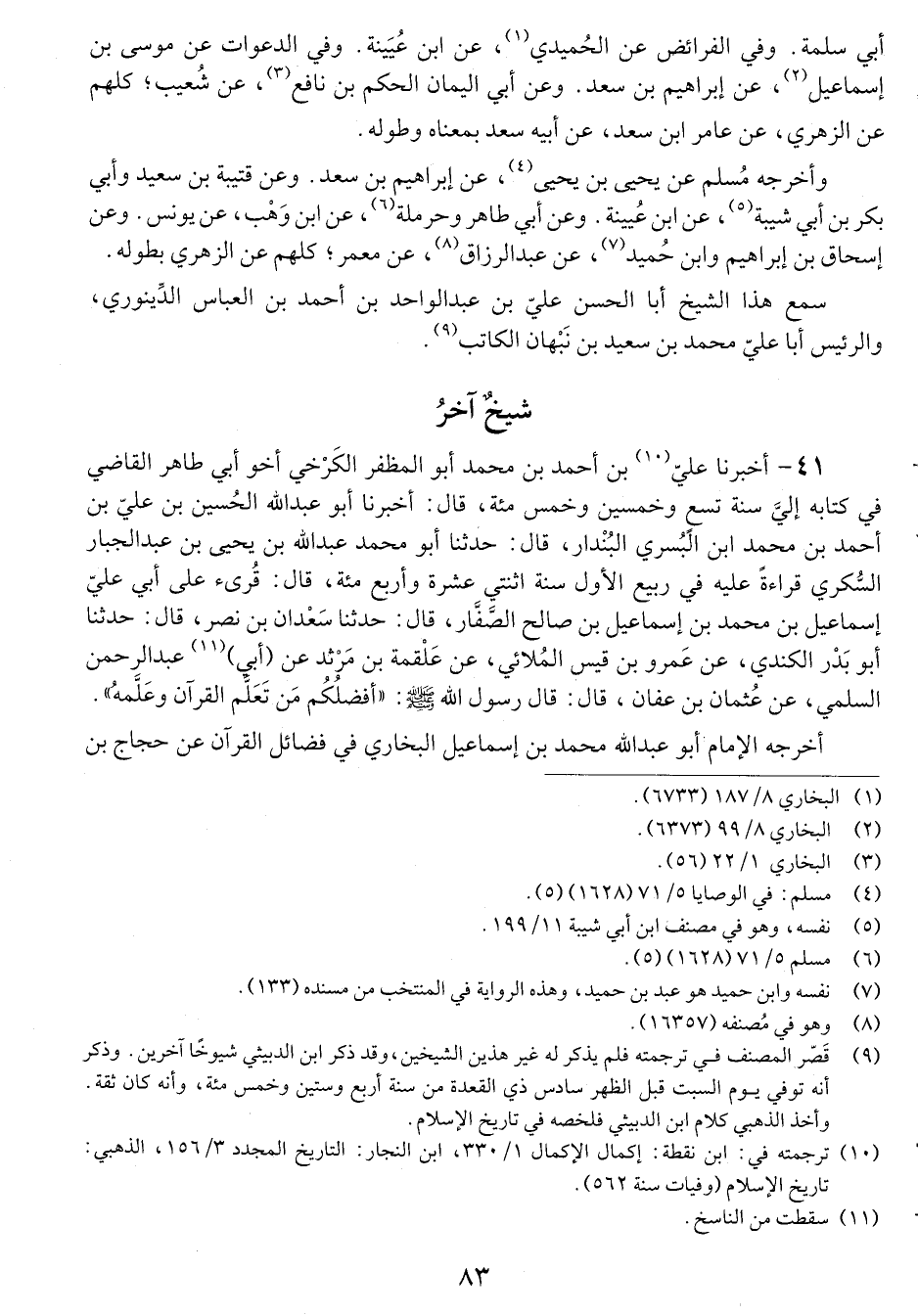 41 - أَخْبَرَنَا عَلِيُّ بْنُ أَحْمَدَ بْنِ مُحَمَّدٍ أَبُو الْمُظَفَّرِ الْكَرْخِيُّ أَخُو أَبِي طَاهِرٍ الْقَاضِي، فِي كِتَابِهِ إِلَيَّ سَنَةَ تِسْعٍ وَخَمْسِينَ وَخَمْسِ مِائَةٍ، أَخْبَرَنَا أَبُو عَبْدِ اللَّهِ الْحُسَيْنُ بْنُ عَلِيِّ بْنِ أَحْمَدَ بْنِ مُحَمَّدِ بْنِ الْبُسْرِيِّ الْبُنْدَارُ، حَدَّثَنَا أَبُو مُحَمَّدٍ عَبْدُ اللَّهِ بْنُ يَحْيَى بْنِ عَبْدِ الْجَبَّارِ السُّكَّرِيُّ، قِرَاءَةً عَلَيْهِ، فِي رَبِيعٍ الأَوَّلِ سَنَةَ اثْنَتَيْ عَشْرَةَ وَأَرْبَعِ مِائَةٍ، قَالَ: قُرِئَ عَلَى أَبِي عَلِيٍّ إِسْمَاعِيلَ بْنِ مُحَمَّدِ بْنِ إِسْمَاعِيلَ بْنِ صَالِحٍ الصَّفَّارِ، حَدَّثَنَا سَعْدَانُ بْنُ نَصْرٍ، حَدَّثَنَا أَبُو بَدْرٍ السَّكُونِيُّ، عَنْ عَمْرِو بْنِ قَيْسٍ الْمُلائِيِّ، عَنْ عَلْقَمَةَ بْنِ مَرْثَدٍ، عَنْ أَبِي عَبْدِ الرَّحْمَنِ السُّلَمِيِّ، عَنْ عُثْمَانَ بْنِ عَفَّانَ: قَالَ رَسُولُ اللَّهِ صَلَّى اللَّهُ عَلَيْهِ وَسَلَّمَ: «أَفْضَلُكُمْ مَنْ تَعَلَّمَ الْقُرْآنَ وَعَلَّمَهُ» ، أَخْرَجَهُ الإِمَامُ أَبُو عَبْدِ اللَّهِ مُحَمَّدُ بْنُ إِسْمَاعِيلَ الْبُخَارِيُّ فِي (فَضَائِلِ الْقُرْآنِ) ، عَنْ حَجَّاجِ بْنِ