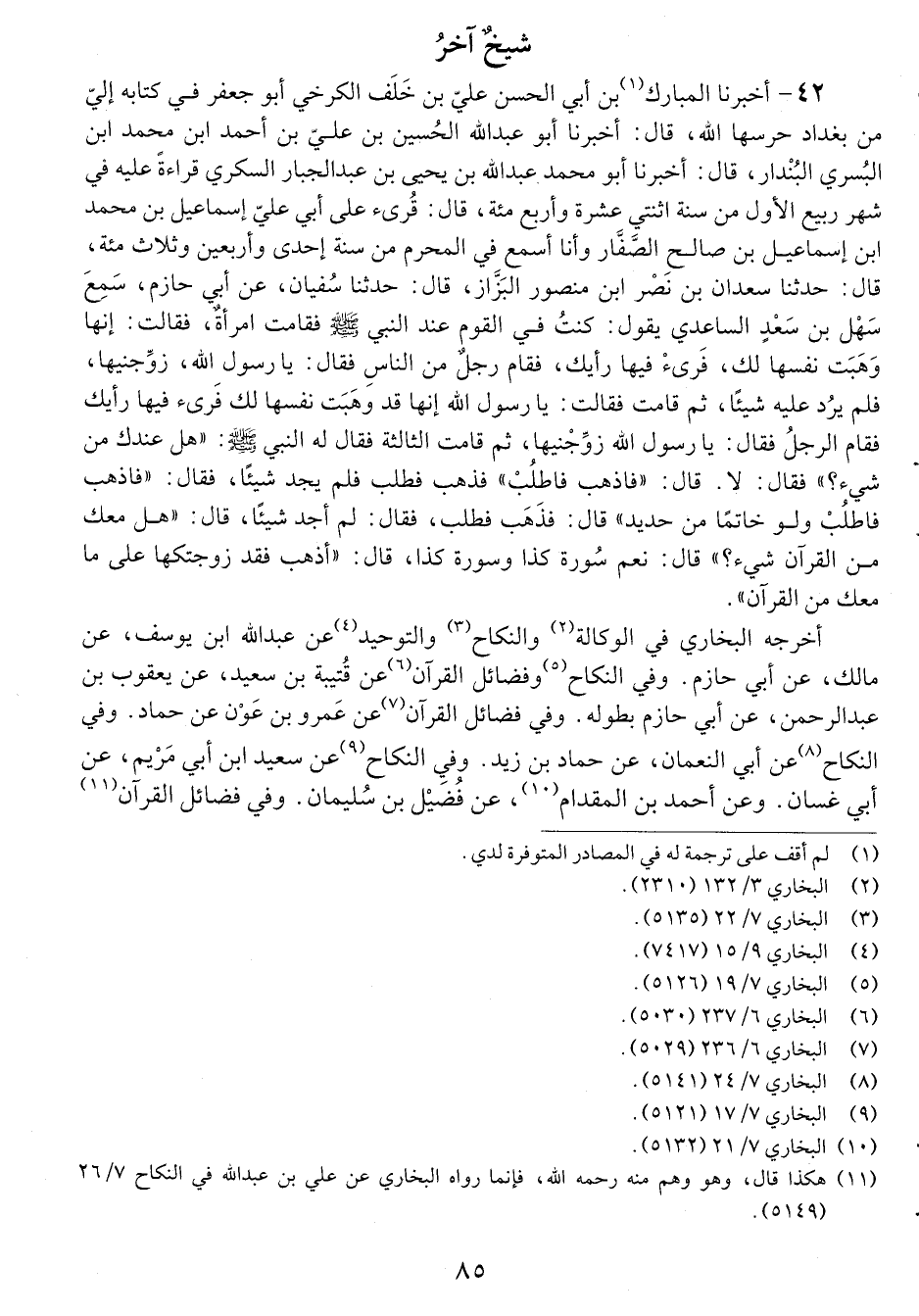 42 - أَخْبَرَنَا الْمُبَارَكُ بْنُ أَبِي الْحَسَنِ عَلِيُّ بْنُ خَلَفٍ الْكَرْخِيُّ أَبُو جَعْفٍر، فِي كِتَابِهِ إِلَيَّ مِنْ بَغْدَادَ، حَرَسَهَا اللَّهُ، حَدَّثَنَا أَبُو عَبْدِ اللَّهِ الْحُسَيْنُ بْنُ عَلِيِّ بْنِ أَحْمَدَ بْنِ مُحَمَّدِ بْنِ الْبُسْرِيِّ بْنِ الْبُنْدَارِ، أَخْبَرَنَا أَبُو مُحَمَّدٍ عَبْدُ اللَّهِ بْنُ يَحْيَى بْنِ عَبْدِ الْجَبَّارِ السُّكَّرِيُّ، قِرَاءَةً عَلَيْهِ، فِي شَهْرِ رَبِيعٍ الأَوَّلِ مِنْ سَنَةِ اثْنَتَيْ عَشْرَةَ وَأَرْبَعِ مِائَةٍ، قَالَ: قُرِئَ عَلَى أَبِي عَلِيٍّ إِسْمَاعِيلَ بْنِ مُحَمَّدِ بْنِ إِسْمَاعِيلَ بْنِ صَالِحٍ الصَّفَّارِ، وَأَنَا أَسْمَعُ، فِي الْمُحَرَّمِ مِنْ سَنَةِ إِحْدَى وَأَرْبَعِينَ وَثَلاثِ مِائَةٍ، حَدَّثَنَا سَعْدَانُ بْنُ نَصْرِ بْنِ مَنْصُورٍ الْبَزَّازُ، حَدَّثَنَا سُفْيَانُ، عَنْ أَبِي حَازِمٍ، سَمِعَ سَهْلَ بْنَ سَعْدٍ السَّاعِدِيَّ، يَقُولُ: كُنْتُ فِي الْقَوْمِ عِنْدَ النَّبِيِّ صَلَّى اللَّهُ عَلَيْهِ وَسَلَّمَ، فَقَامَتِ امْرَأَةٌ، فَقَالَتْ: إِنَّهَا وَهَبَتْ نَفْسَهَا لَكَ فَرِأْ فِيهَا رَأْيَكَ، فَقَامَ رَجُلٌ مِنَ النَّاسِ، فَقَالَ: يَا رَسُولَ اللَّهِ، زَوِّجْنِيهَا، فَلَمْ يَرُدَّ عَلَيْهِ شَيْئًا، ثُمَّ قَامَتْ، فَقَالَتْ: يَا رَسُولَ اللَّهِ، إِنَّهَا قَدْ وَهَبَتْ نَفْسَهَا لَكَ، فَرِأْ فِيهَا رَأْيَكَ، فَقَامَ الرَّجُلُ، فَقَالَ: يَا رَسُولَ اللَّهِ، زَوِّجْنِيهَا، ثُمَّ قَامَتِ الثَّالِثَةَ، فَقَالَ لَهُ النَّبِيُّ صَلَّى اللَّهُ عَلَيْهِ وَسَلَّمَ: " هَلْ عِنْدَكَ مِنْ شَيْءٍ؟ فَقَالَ: لا.