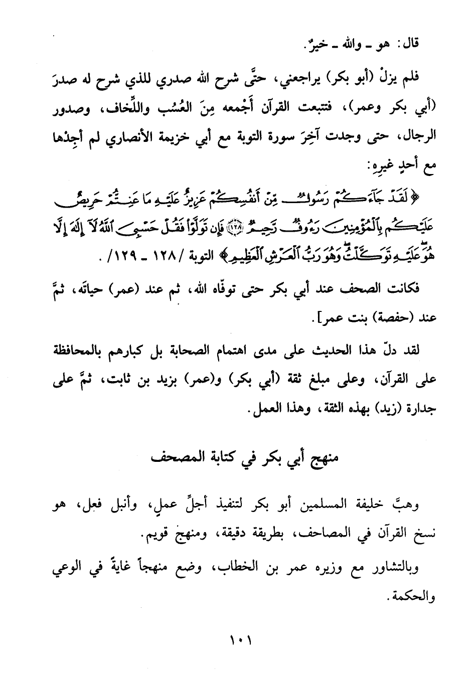 فلم يزل (أبو بكر) يراجعني، حتّى شرح الله صدري للذي شرح له صدر (أبي بكر وعمر)، فتتبعت القرآن أجمعه من العسب واللّخاف، وصدور الرجال، حتى وجدت آخر سورة التوبة مع أبي خزيمة الأنصاري لم أجدها مع أحد غيره: