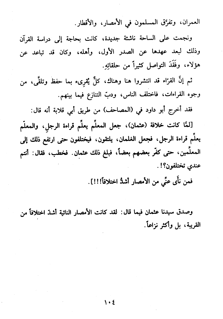 [لمّا كانت خلافة (عثمان)، جعل المعلّم يعلّم قراءة الرجل، والمعلّم يعلّم قراءة الرجل، فجعل الغلمان، يلتقون، فيختلفون حتى ارتفع ذلك إلى المعلّمين، حتى كفّر بعضهم بعضا، فبلغ ذلك عثمان. فخطب، فقال: أنتم عندي تختلفون؟!.