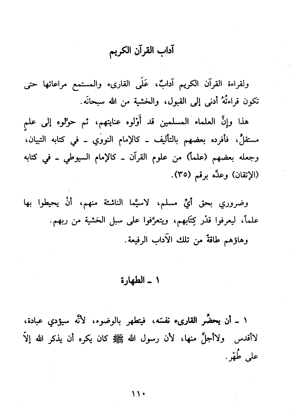 1 - أن يحضّر القارئ نفسه، فيتطهر بالوضوء، لأنّه سيؤدي عبادة، لا أقدس ولا أجلّ منها، لأن رسول الله صلى الله عليه وسلم كان يكره أن يذكر الله إلّا على طهر.