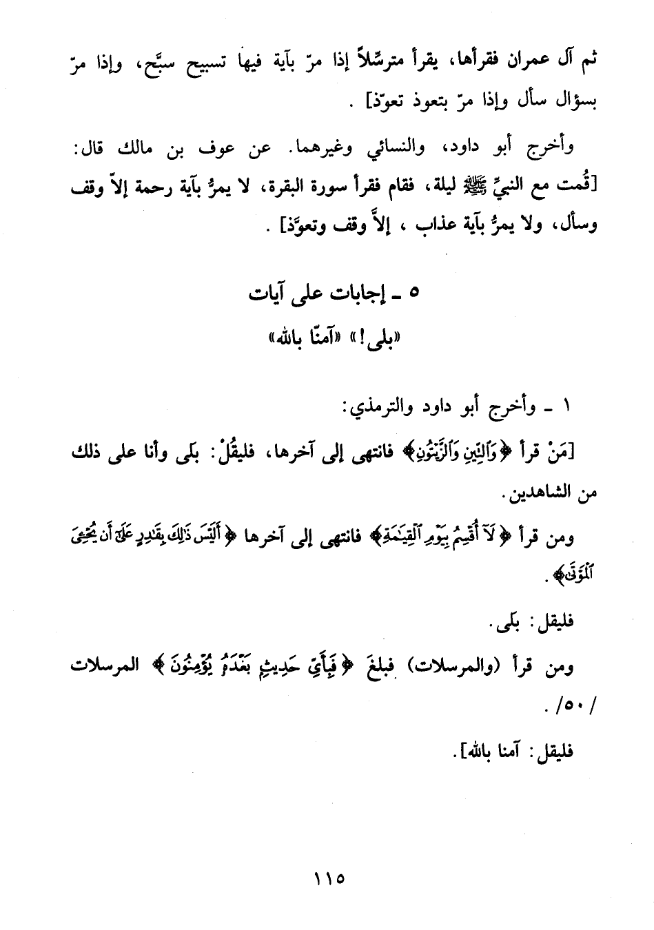 [من قرأ وَالتِّينِ وَالزَّيْتُونِ فانتهى إلى آخرها، فليقل: بلى وأنا على ذلك من الشاهدين.