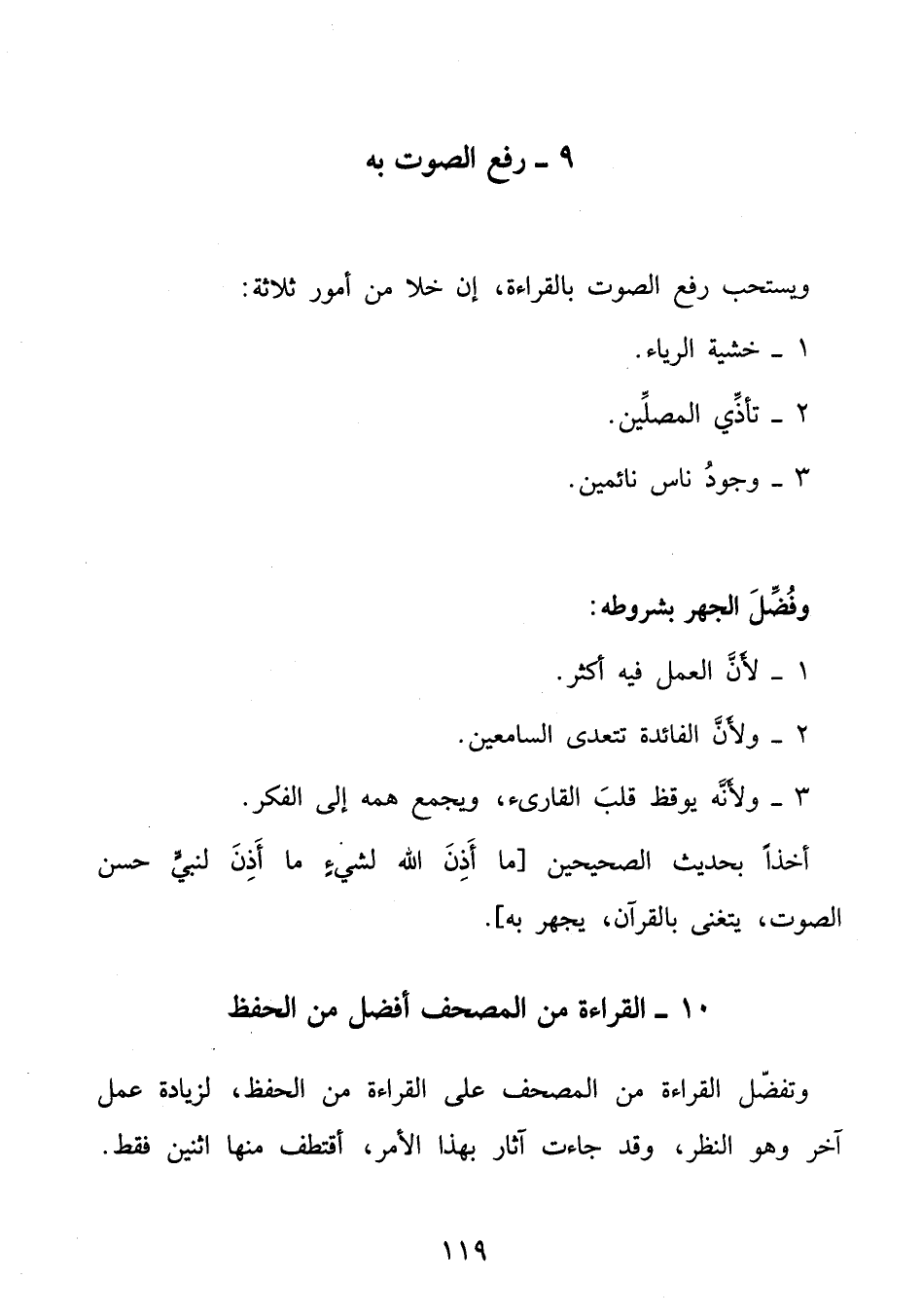 ويستحب رفع الصوت بالقراءة، إن خلا من أمور ثلاثة: