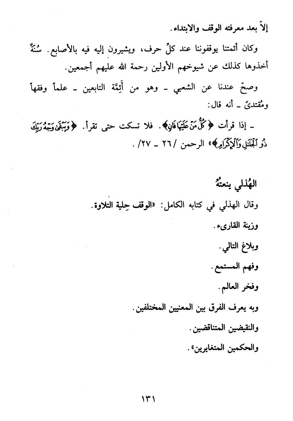 وقال الهذلي في كتابه الكامل: «الوقف حلية التلاوة.