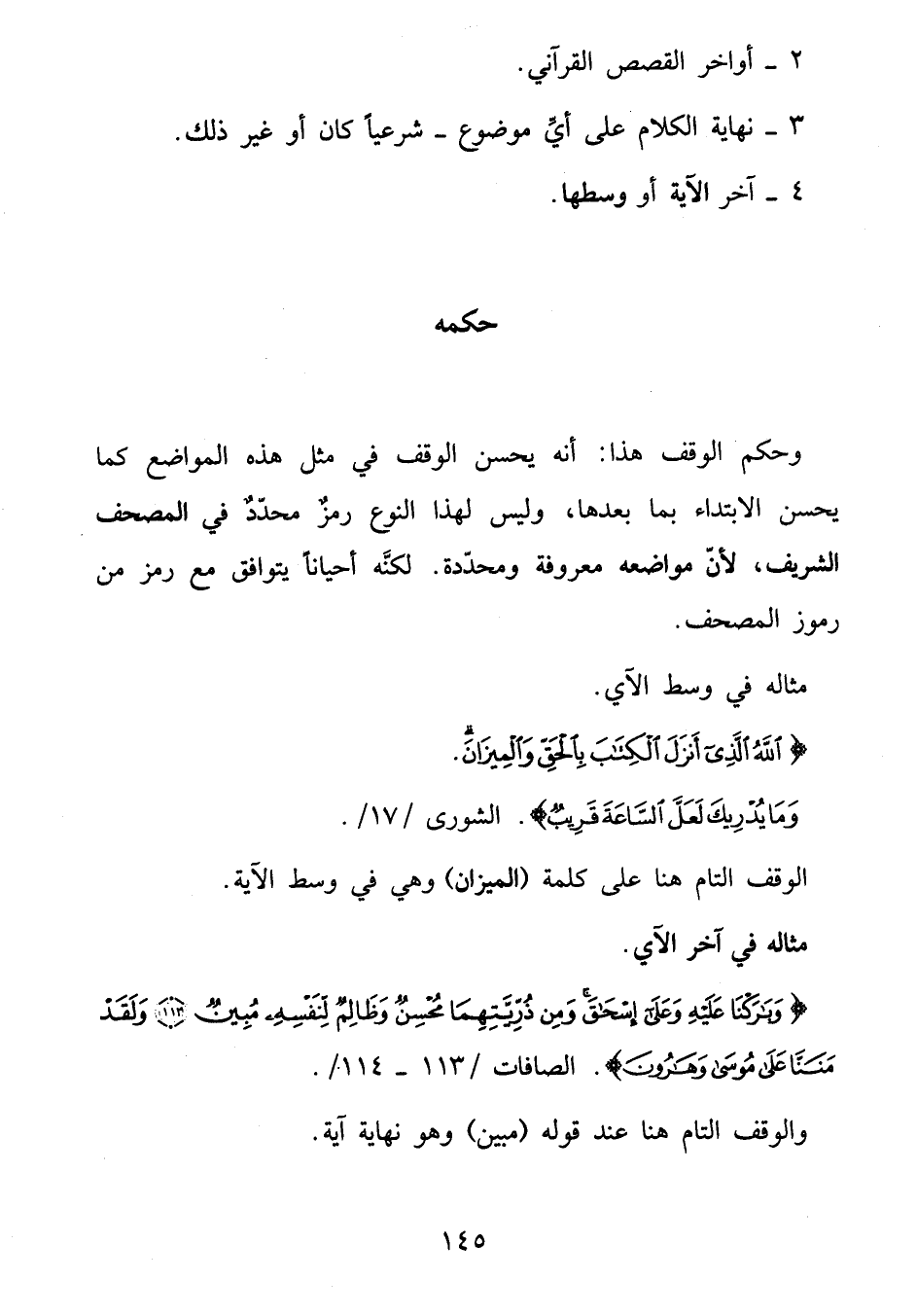 وحكم الوقف هذا: أنه يحسن الوقف في مثل هذه المواضع كما يحسن الابتداء بما بعدها، وليس لهذا النوع رمز محدّد في المصحف الشريف، لأنّ مواضعه معروفة ومحدّدة. لكنّه أحيانا يتوافق مع رمز من رموز المصحف.