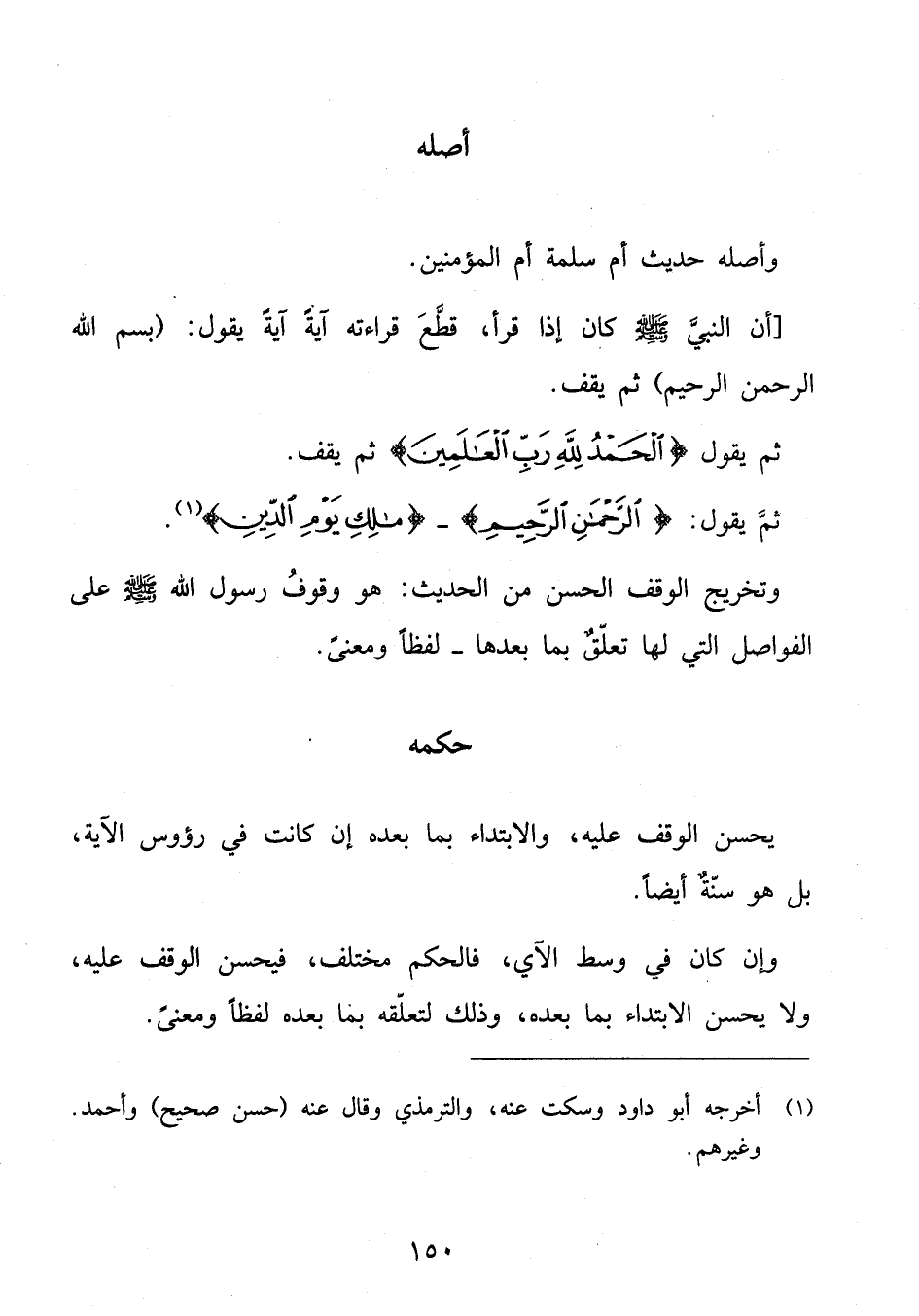 [أن النبيّ صلى الله عليه وسلم كان إذا قرأ، قطّع قراءته آية آية يقول: بِسْمِ اللَّهِ الرَّحْمنِ الرَّحِيمِ ثم يقف.