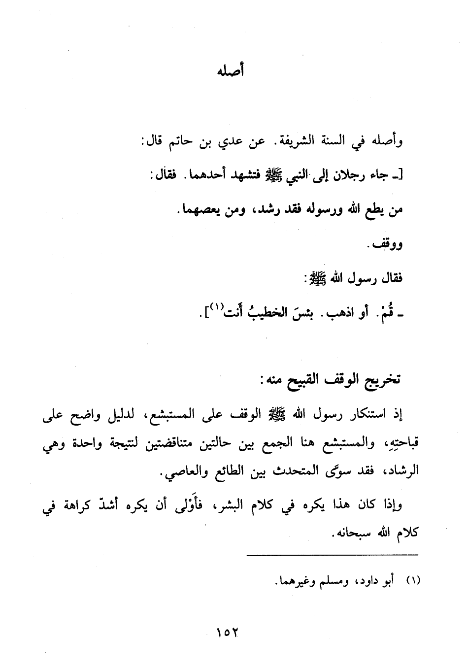 : إذ استنكار رسول الله صلى الله عليه وسلم الوقف على المستبشع، لدليل واضح على قباحته، والمستبشع هنا الجمع بين حالتين متناقضتين لنتيجة واحدة وهي الرشاد، فقد سوّى المتحدث بين الطائع والعاصي.