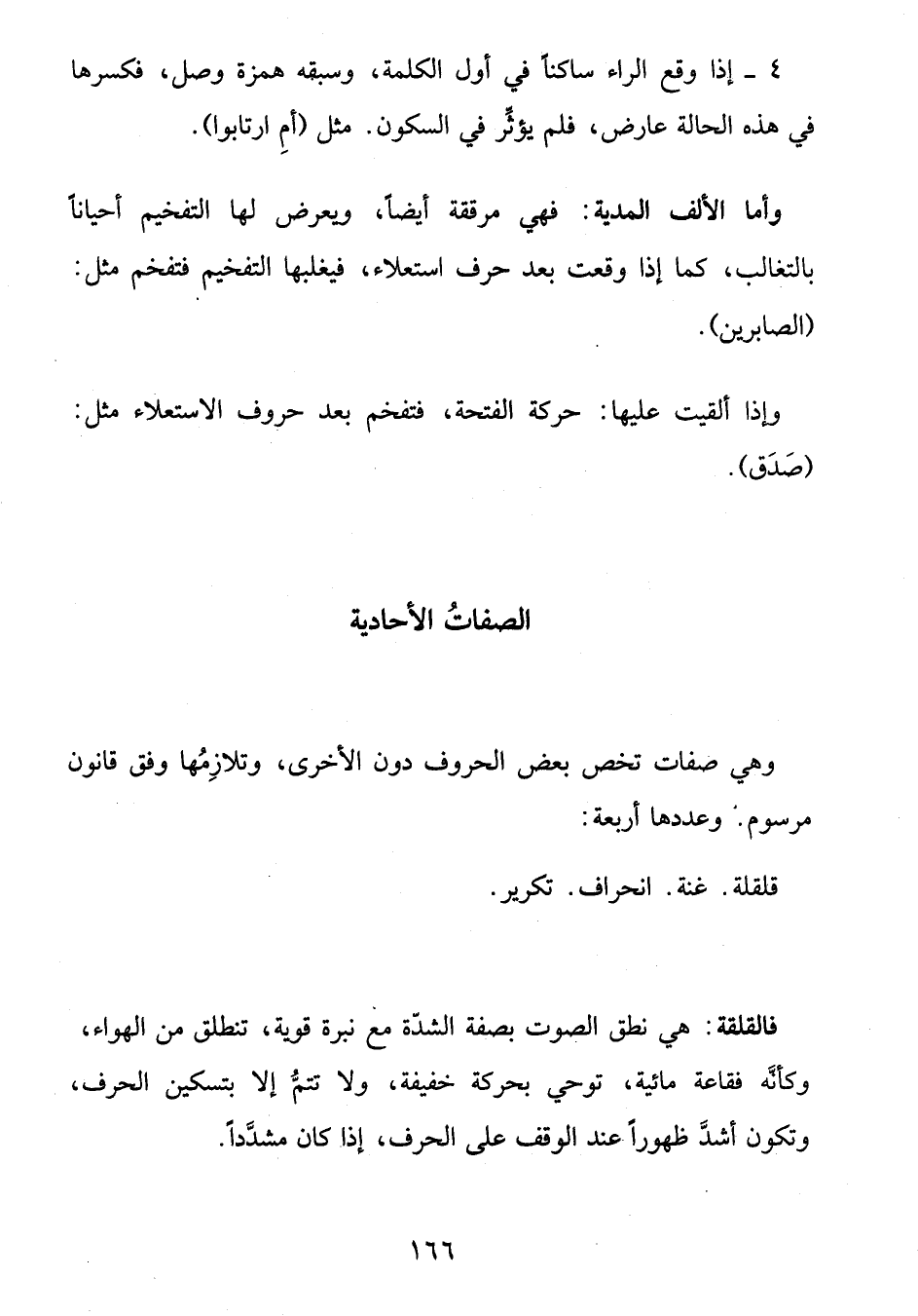 وأما الألف المدية: فهي مرققة أيضا، ويعرض لها التفخيم أحيانا بالتغالب، كما إذا وقعت بعد حرف استعلاء، فيغلبها التفخيم فتفخم مثل: