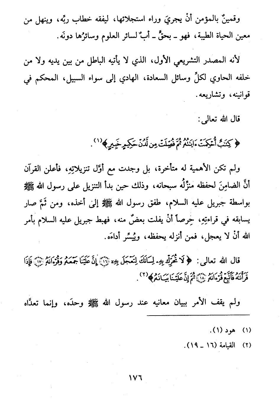 قال الله تعالى: لا تُحَرِّكْ بِهِ لِسانَكَ لِتَعْجَلَ بِهِ (16) إِنَّ عَلَيْنا جَمْعَهُ وَقُرْآنَهُ (7) فَإِذا قَرَأْناهُ فَاتَّبِعْ قُرْآنَهُ (18) ثُمَّ إِنَّ عَلَيْنا بَيانَهُ (¬2).