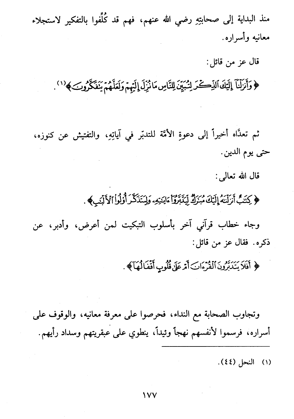 منذ البداية إلى صحابته رضي الله عنهم، فهم قد كلّفوا بالتفكير لاستجلاء معانيه وأسراره.