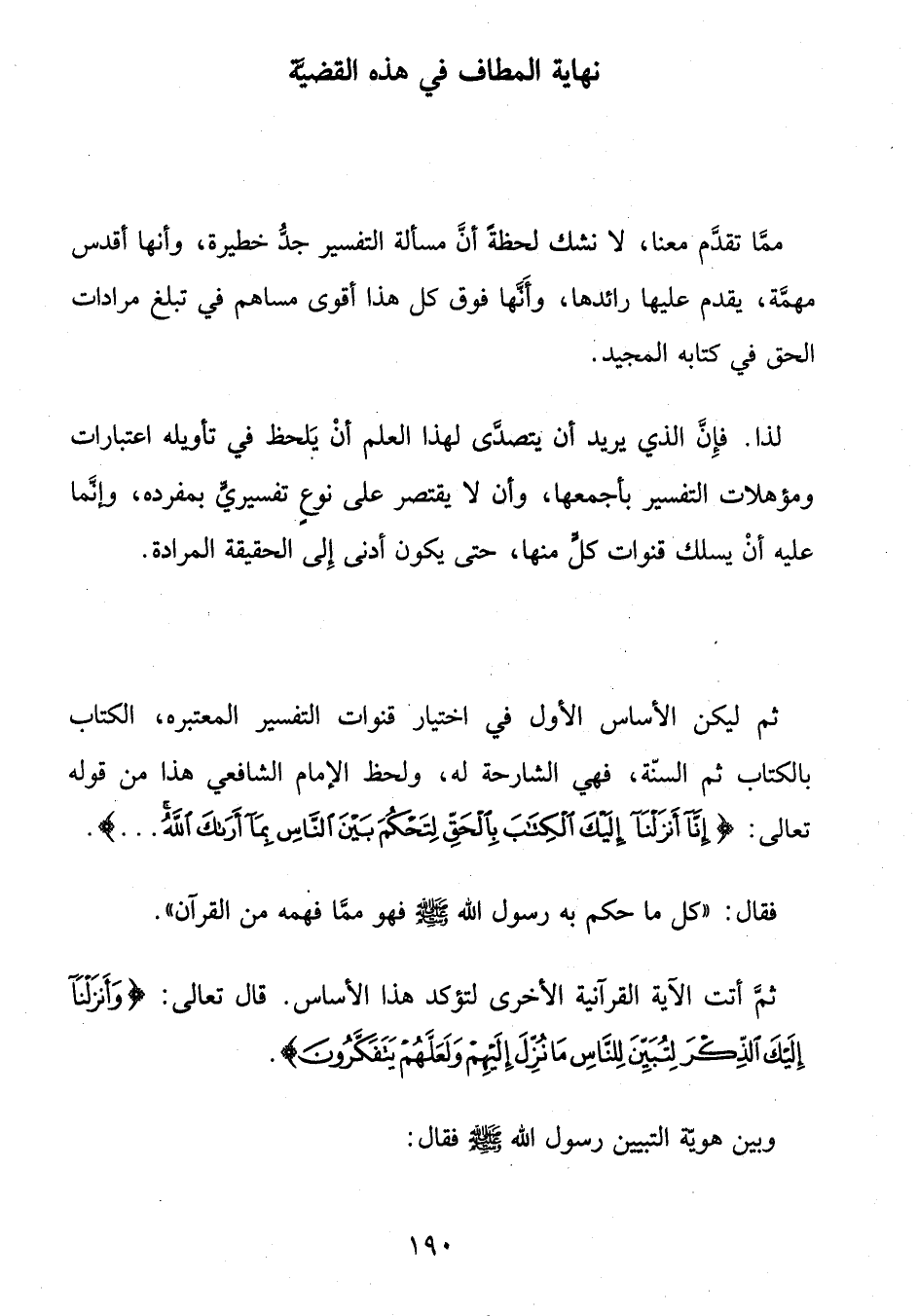 ثم ليكن الأساس الأول في اختيار قنوات التفسير المعتبرة، الكتاب بالكتاب ثم السنّة، فهي الشارحة له، ولحظ الإمام الشافعي هذا من قوله تعالى: إِنَّا أَنْزَلْنا إِلَيْكَ الْكِتابَ بِالْحَقِّ لِتَحْكُمَ بَيْنَ النَّاسِ بِما أَراكَ اللَّهُ ....