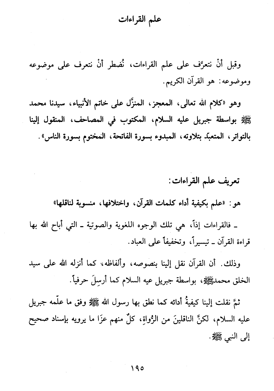 : هو: «علم بكيفية أداء كلمات القرآن، واختلافها، منسوبة لناقلها» - فالقراءات إذا، هي تلك الوجوه اللغوية والصوتية- التي أباح الله بها قراءة القرآن- تيسيرا، وتخفيفا على العباد.