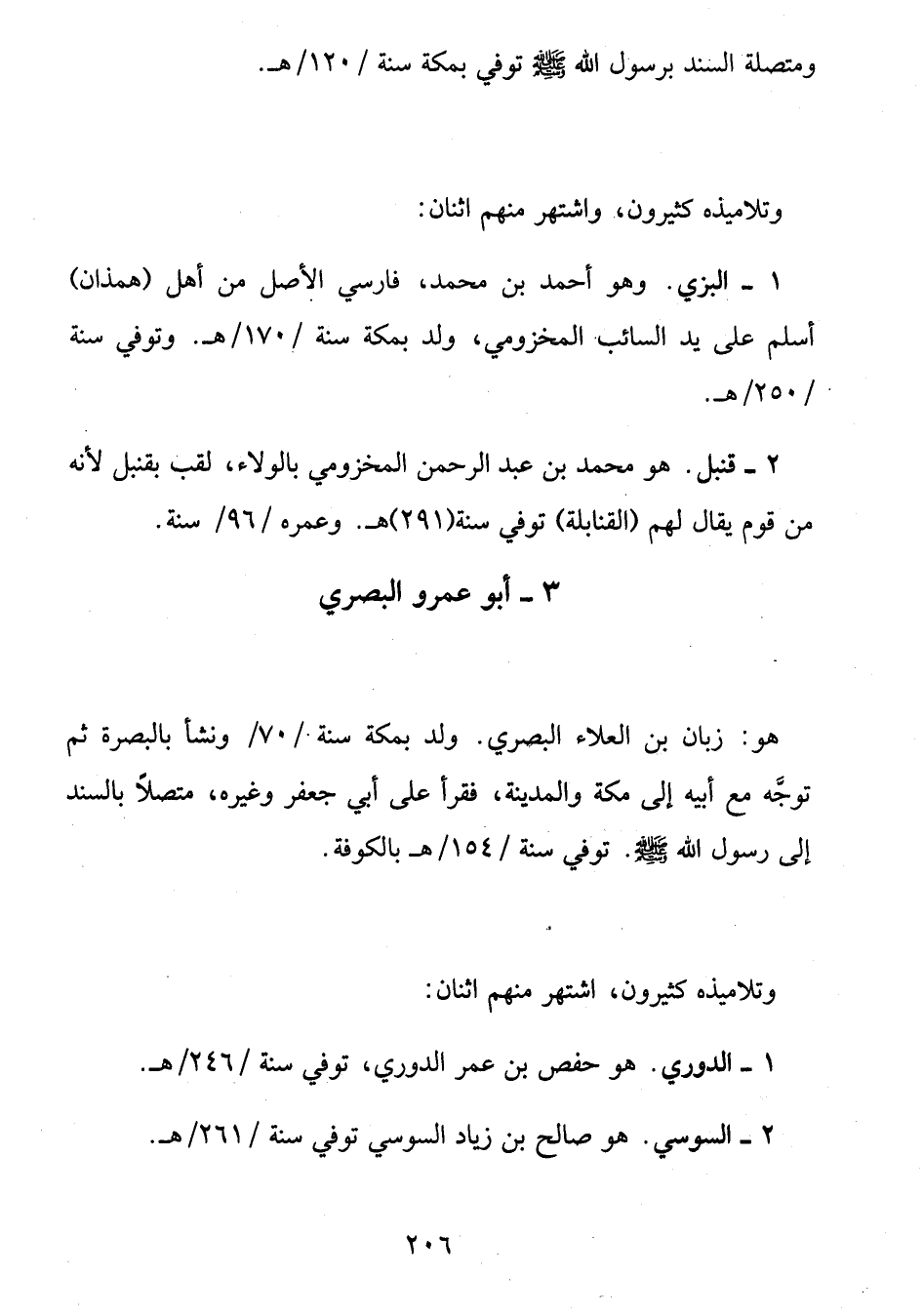 1 - البزي. وهو أحمد بن محمد، فارسي الأصل من أهل (همذان) أسلم على يد السائب المخزومي، ولد بمكة سنة/ 170/ هـ. وتوفي سنة/ 250/ هـ.