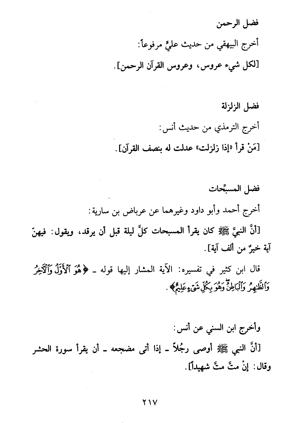 [أنّ النبيّ صلى الله عليه وسلم كان يقرأ المسبحات كلّ ليلة قبل أن يرقد، ويقول: فيهنّ آية خير من ألف آية].
