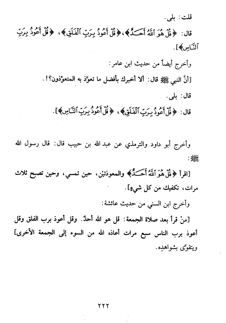 قال: قُلْ هُوَ اللَّهُ أَحَدٌ، قُلْ أَعُوذُ بِرَبِّ الْفَلَقِ، قُلْ أَعُوذُ بِرَبِّ النَّاسِ].