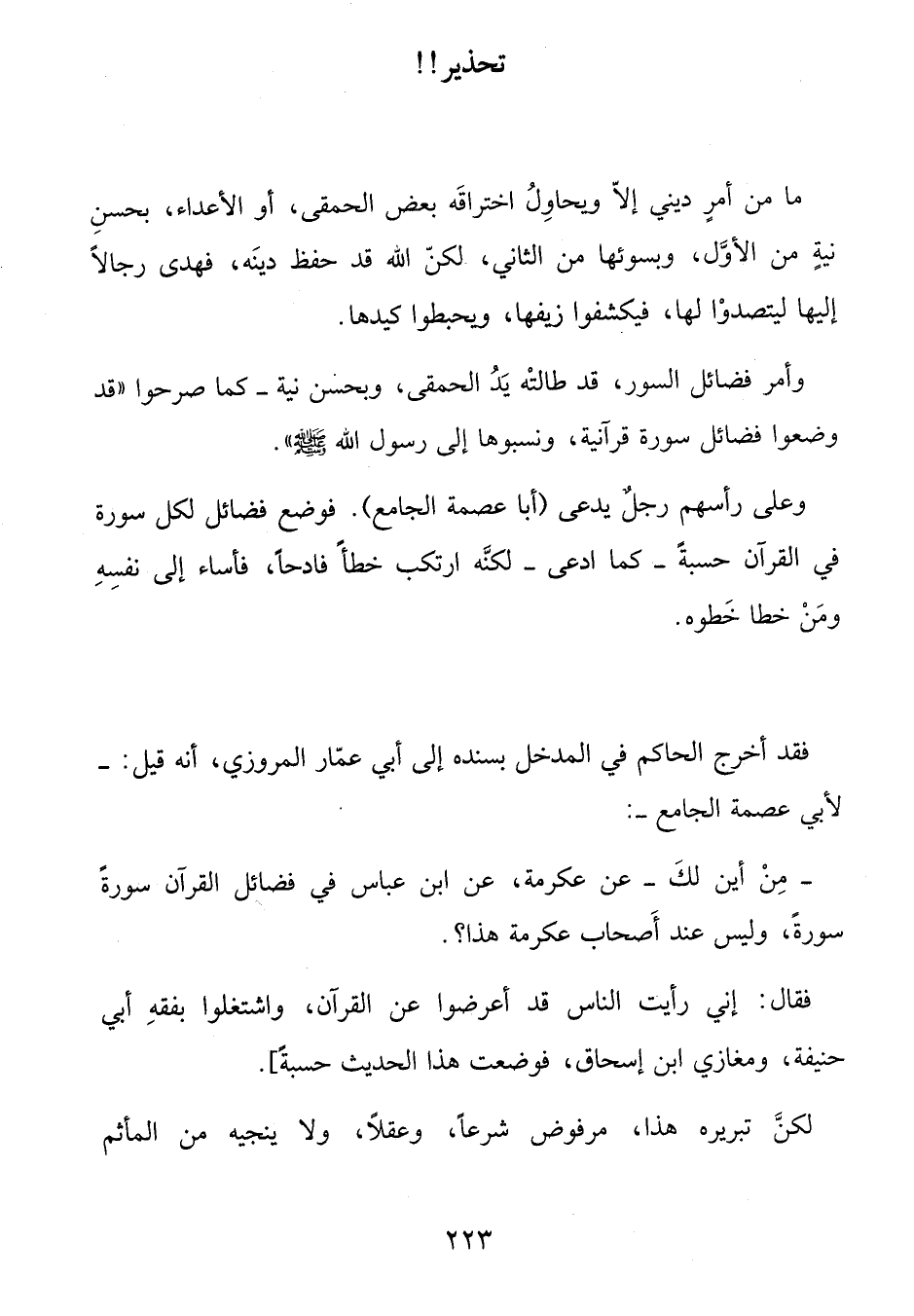 وأمر فضائل السور، قد طالته يد الحمقى، وبحسن نية- كما صرحوا «قد وضعوا فضائل سورة قرآنية، ونسبوها إلى رسول الله صلى الله عليه وسلم».