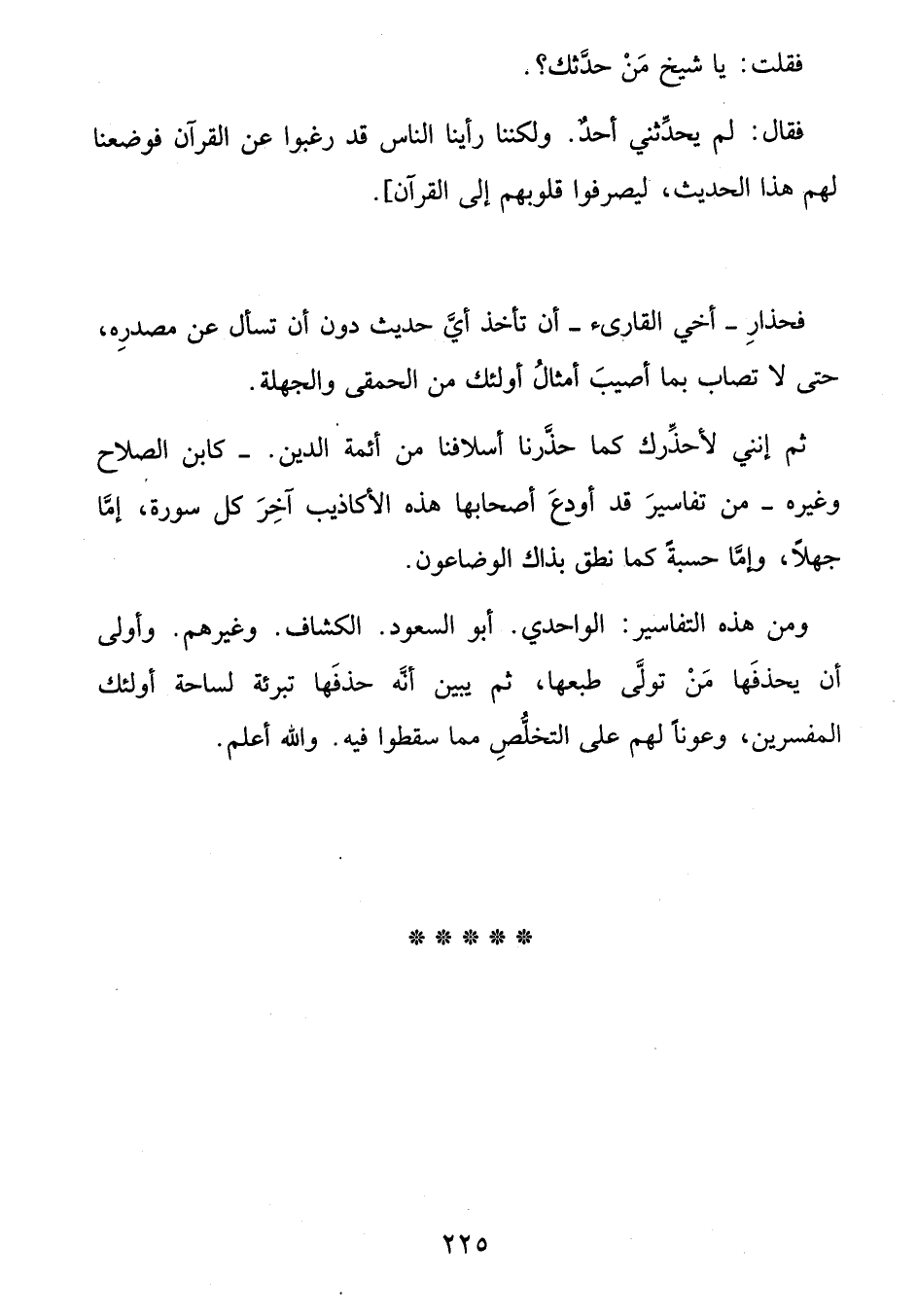 ثم إنني لأحذّرك كما حذّرنا أسلافنا من أئمة الدين.- كابن الصلاح وغيره- من تفاسير قد أودع أصحابها هذه الأكاذيب آخر كل سورة، إمّا جهلا، وإمّا حسبة كما نطق بذاك الوضاعون.