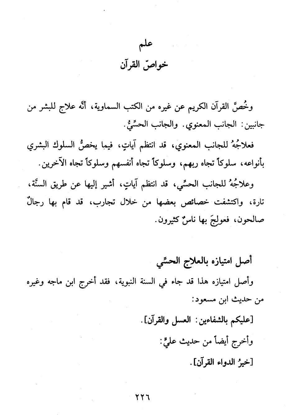 وخصّ القرآن الكريم عن غيره من الكتب السماوية، أنّه علاج للبشر من جانبين: الجانب المعنوي. والجانب الحسّيّ.