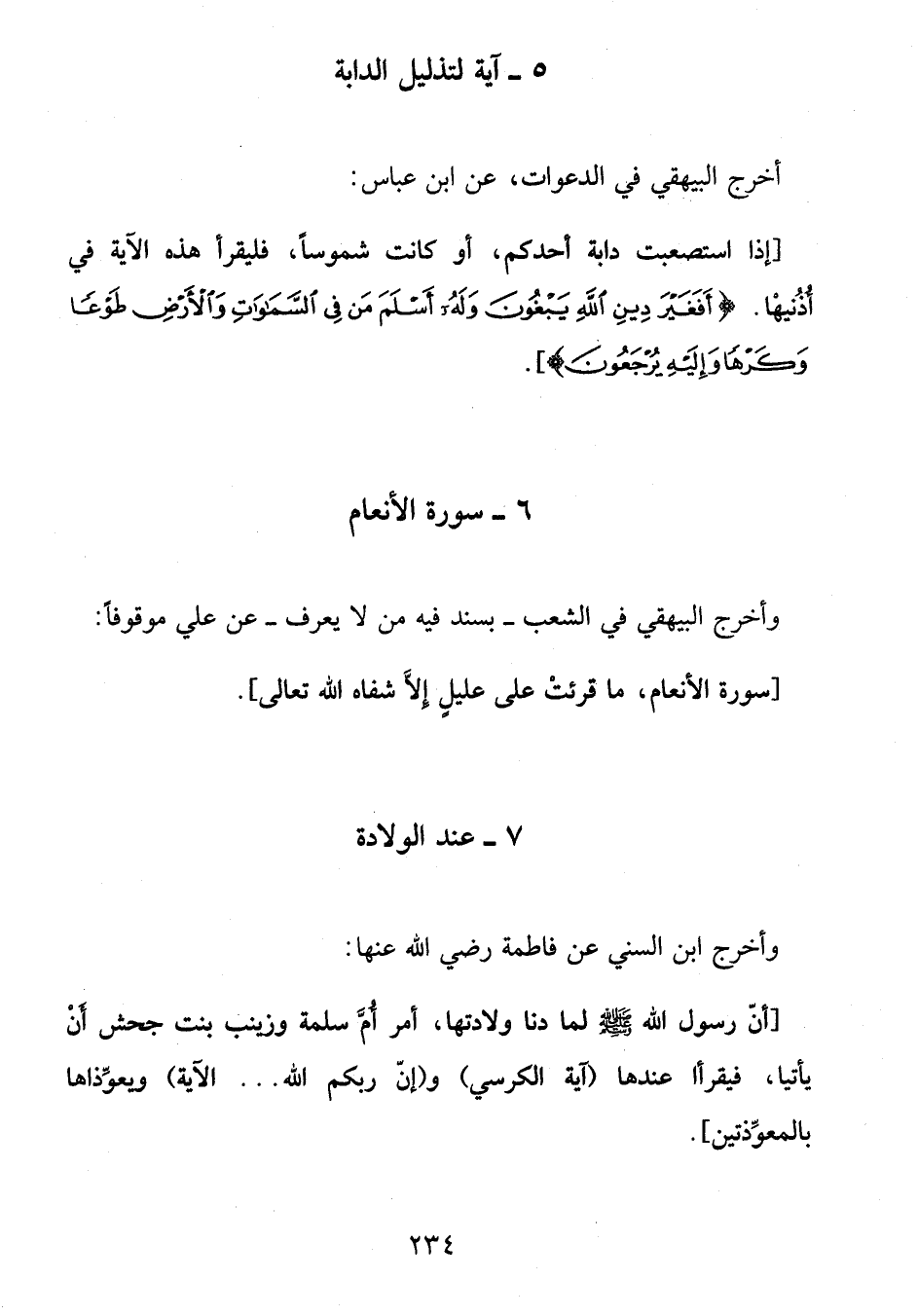 [إذا استصعبت دابة أحدكم، أو كانت شموسا، فليقرأ هذه الآية في أذنيها. أَفَغَيْرَ دِينِ اللَّهِ يَبْغُونَ وَلَهُ أَسْلَمَ مَنْ فِي السَّماواتِ وَالْأَرْضِ طَوْعاً وَكَرْهاً وَإِلَيْهِ يُرْجَعُونَ].