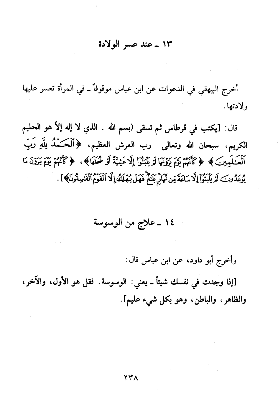 قال: [يكتب في قرطاس ثم تسقى (بسم الله. الذي لا إله إلّا هو الحليم الكريم، سبحان الله وتعالى رب العرش العظيم، الْحَمْدُ لِلَّهِ رَبِّ الْعالَمِينَ* كَأَنَّهُمْ يَوْمَ يَرَوْنَها لَمْ يَلْبَثُوا إِلَّا عَشِيَّةً أَوْ ضُحاها، كَأَنَّهُمْ يَوْمَ يَرَوْنَ ما يُوعَدُونَ لَمْ يَلْبَثُوا إِلَّا ساعَةً مِنْ نَهارٍ بَلاغٌ فَهَلْ يُهْلَكُ إِلَّا الْقَوْمُ الْفاسِقُونَ].