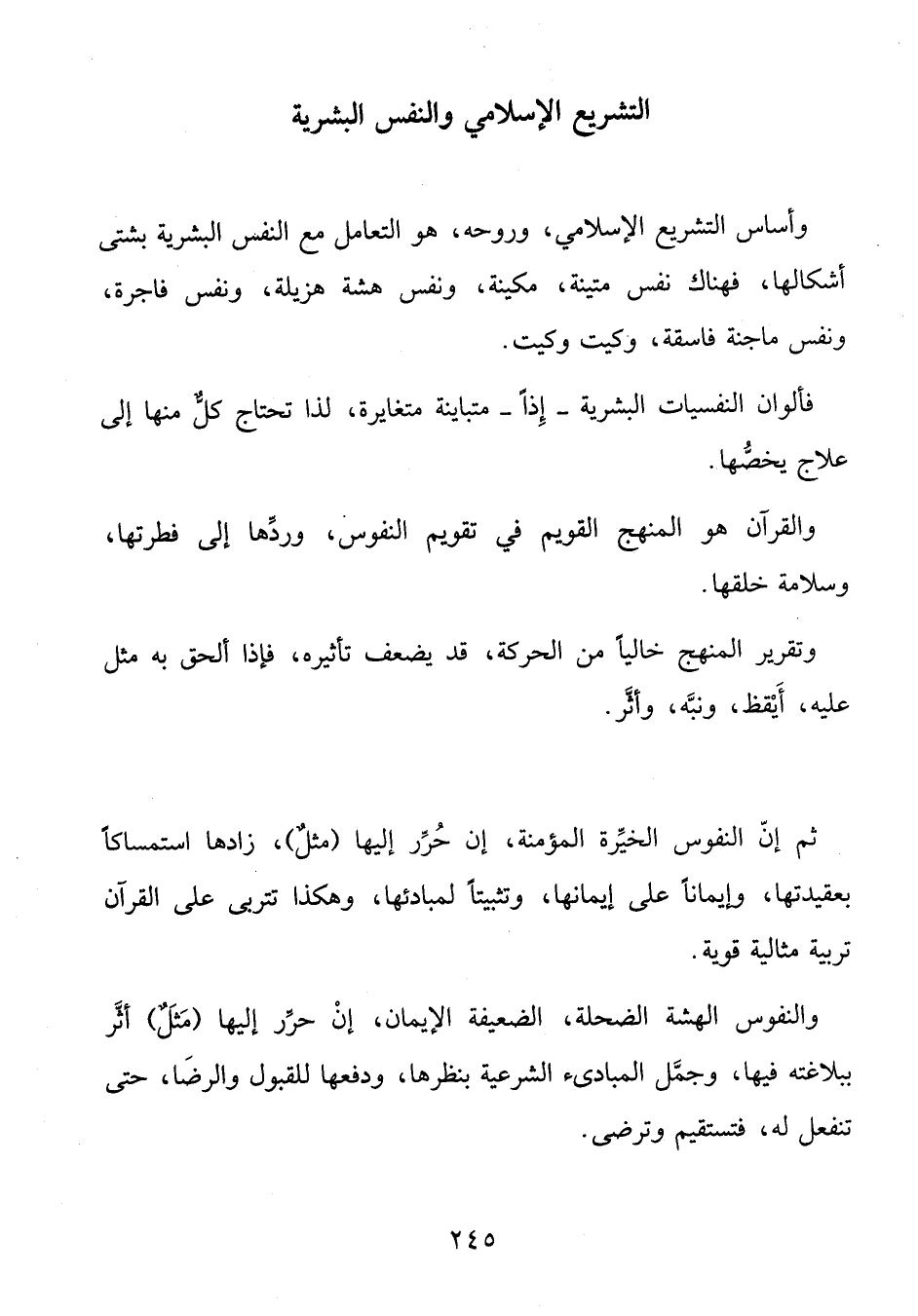 وأساس التشريع الإسلامي، وروحه، هو التعامل مع النفس البشرية بشتى أشكالها، فهناك نفس متينة، مكينة، ونفس هشة هزيلة، ونفس فاجرة، ونفس ما جنة فاسقة، وكيت وكيت.
