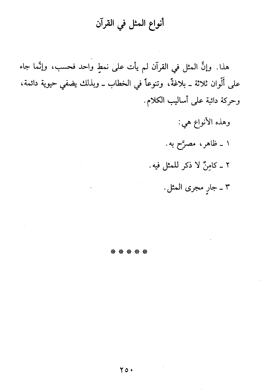 هذا. وإنّ المثل في القرآن لم يأت على نمط واحد فحسب، وإنّما جاء على ألوان ثلاثة- بلاغة، وتنوعا في الخطاب- وبذلك يضفي حيوية دائمة، وحركة دائبة على أساليب الكلام.