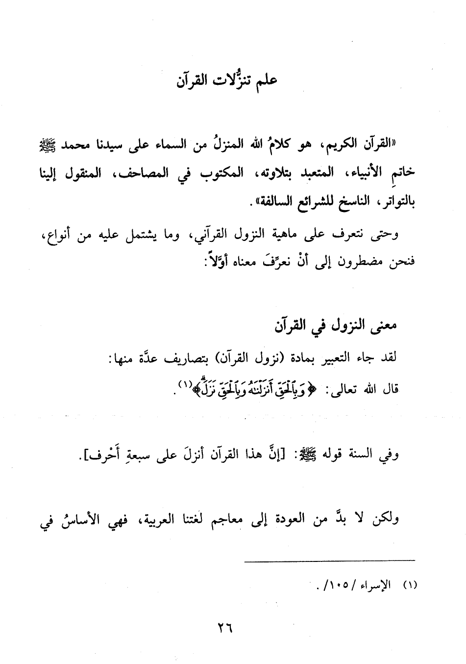 «القرآن الكريم، هو كلام الله المنزل من السماء على سيدنا محمد صلى الله عليه وسلّم خاتم الأنبياء، المتعبد بتلاوته، المكتوب في المصاحف، المنقول إلينا بالتواتر، الناسخ للشرائع السالفة».