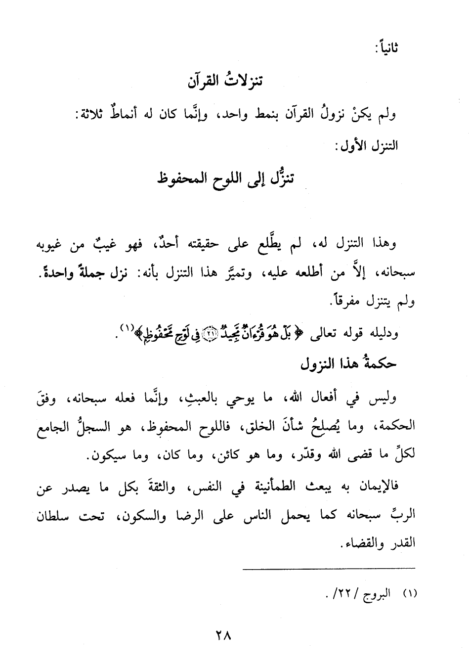 ودليله قوله تعالى بَلْ هُوَ قُرْآنٌ مَجِيدٌ (21) فِي لَوْحٍ مَحْفُوظٍ (¬1).