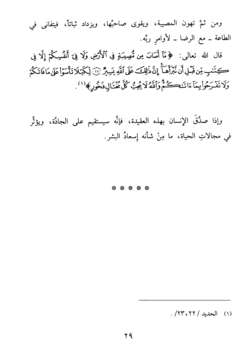 قال الله تعالى: ما أَصابَ مِنْ مُصِيبَةٍ فِي الْأَرْضِ وَلا فِي أَنْفُسِكُمْ إِلَّا فِي كِتابٍ مِنْ قَبْلِ أَنْ نَبْرَأَها إِنَّ ذلِكَ عَلَى اللَّهِ يَسِيرٌ (22) لِكَيْلا تَأْسَوْا عَلى ما فاتَكُمْ وَلا تَفْرَحُوا بِما آتاكُمْ وَاللَّهُ لا يُحِبُّ كُلَّ مُخْتالٍ فَخُورٍ (¬1).