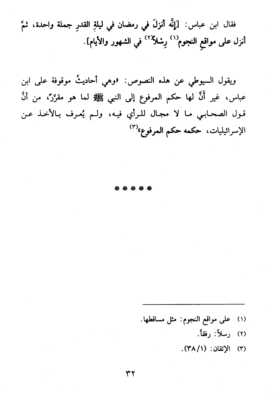 ويقول السيوطي عن هذه النصوص: «وهي أحاديث موقوفة على ابن عباس، غير أنّ لها حكم المرفوع إلى النبي صلى الله عليه وسلم لما هو مقرّر، من أنّ قول الصحابي ما لا مجال للرأي فيه، ولم يعرف بالأخذ عن الإسرائيليات، حكمه حكم المرفوع» (¬3)