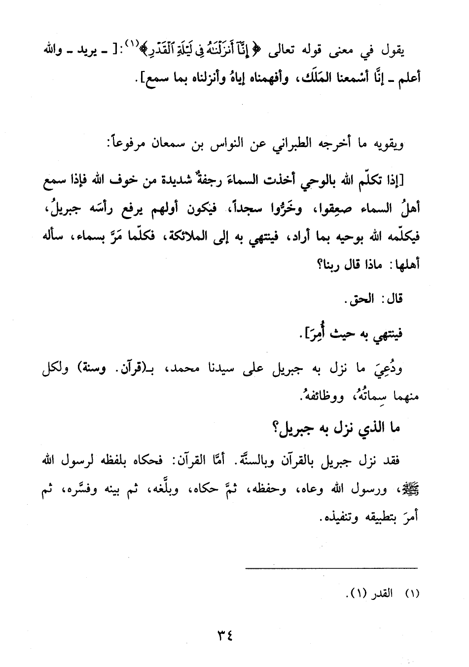 [إذا تكلّم الله بالوحي أخذت السماء رجفة شديدة من خوف الله فإذا سمع أهل السماء صعقوا، وخرّوا سجدا، فيكون أولهم يرفع رأسه جبريل، فيكلّمه الله بوحيه بما أراد، فينتهي به إلى الملائكة، فكلّما مرّ بسماء، سأله أهلها: ماذا قال ربنا؟