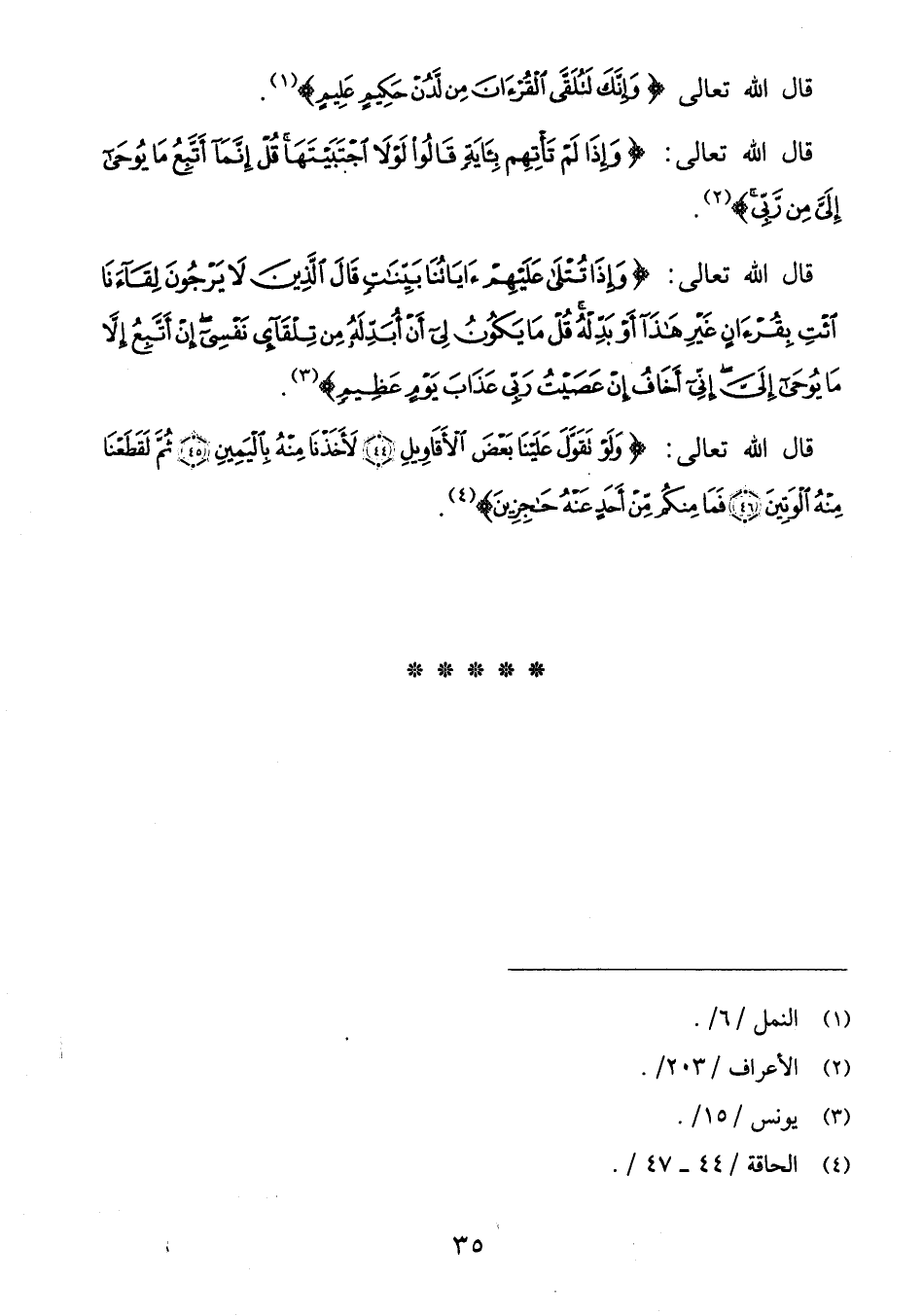 قال الله تعالى: وَإِذا تُتْلى عَلَيْهِمْ آياتُنا بَيِّناتٍ قالَ الَّذِينَ لا يَرْجُونَ لِقاءَنَا ائْتِ بِقُرْآنٍ غَيْرِ هذا أَوْ بَدِّلْهُ قُلْ ما يَكُونُ لِي أَنْ أُبَدِّلَهُ مِنْ تِلْقاءِ نَفْسِي إِنْ أَتَّبِعُ إِلَّا ما يُوحى إِلَيَّ إِنِّي أَخافُ إِنْ عَصَيْتُ رَبِّي عَذابَ يَوْمٍ عَظِيمٍ (¬3).