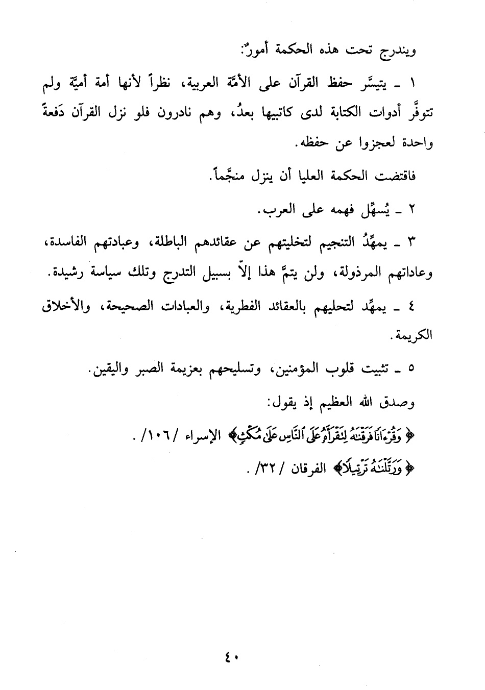 وَقُرْآناً فَرَقْناهُ لِتَقْرَأَهُ عَلَى النَّاسِ عَلى مُكْثٍ الإسراء/ 106/.