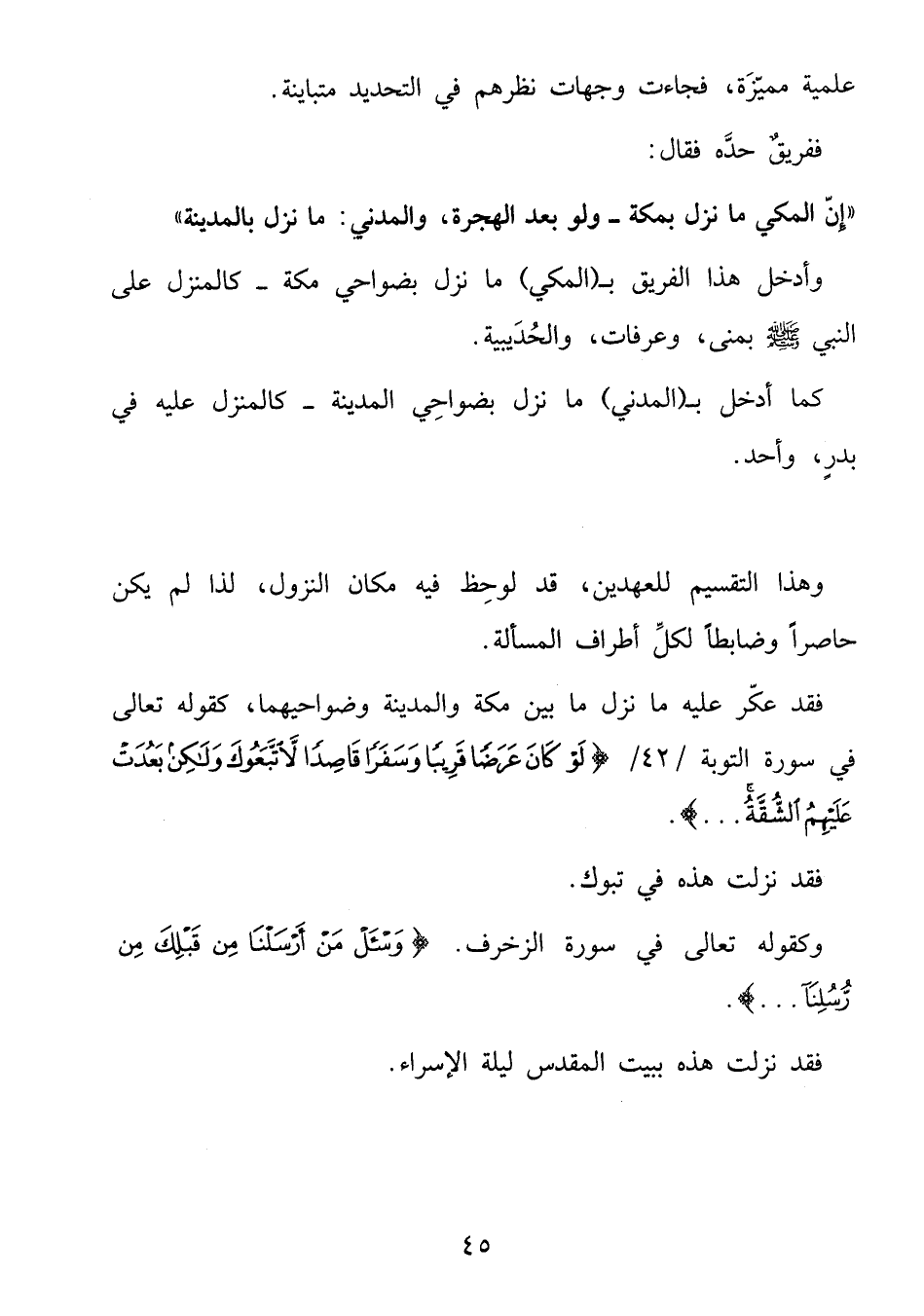 «إنّ المكي ما نزل بمكة- ولو بعد الهجرة، والمدني: ما نزل بالمدينة» وأدخل هذا الفريق ب (المكي) ما نزل بضواحي مكة- كالمنزل على النبي صلى الله عليه وسلم بمنى، وعرفات، والحديبية.
