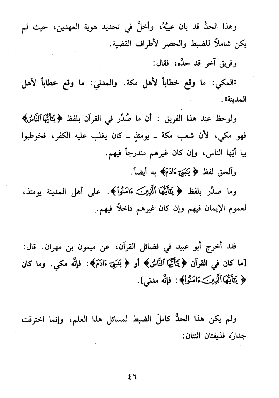 [ما كان في القرآن يا أَيُّهَا النَّاسُ* أو يا بَنِي آدَمَ*: فإنّه مكي. وما كان يا أَيُّهَا الَّذِينَ آمَنُوا*: فإنّه مدني].