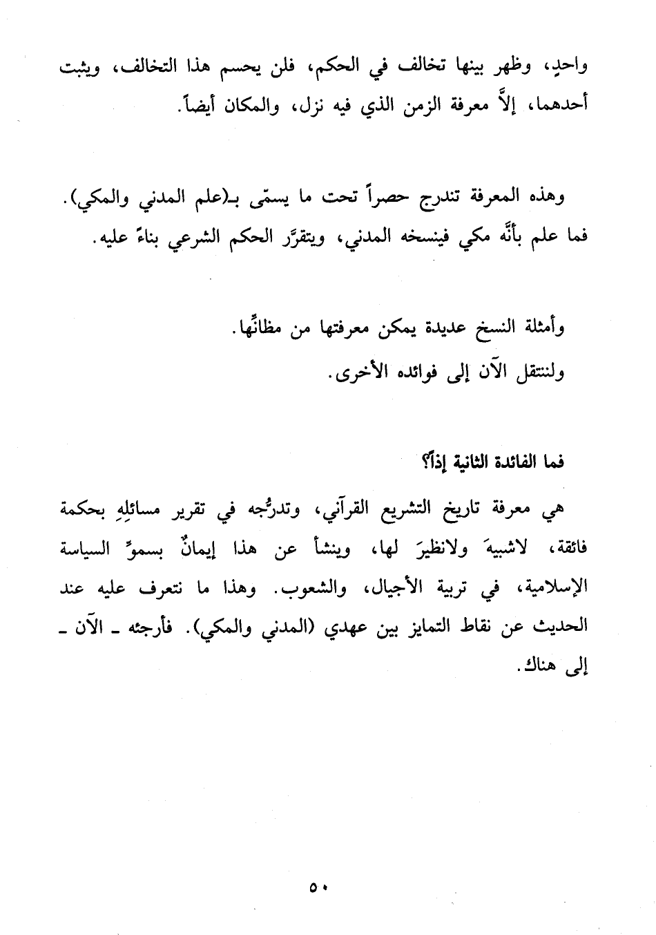 هي معرفة تاريخ التشريع القرآني، وتدرّجه في تقرير مسائله بحكمة فائقة، لا شبيه ولا نظير لها، وينشأ عن هذا إيمان بسموّ السياسة الإسلامية، في تربية الأجيال، والشعوب. وهذا ما نتعرف عليه عند الحديث عن نقاط التمايز بين عهدي (المدني والمكي). فأرجئه- الآن- إلى هناك.