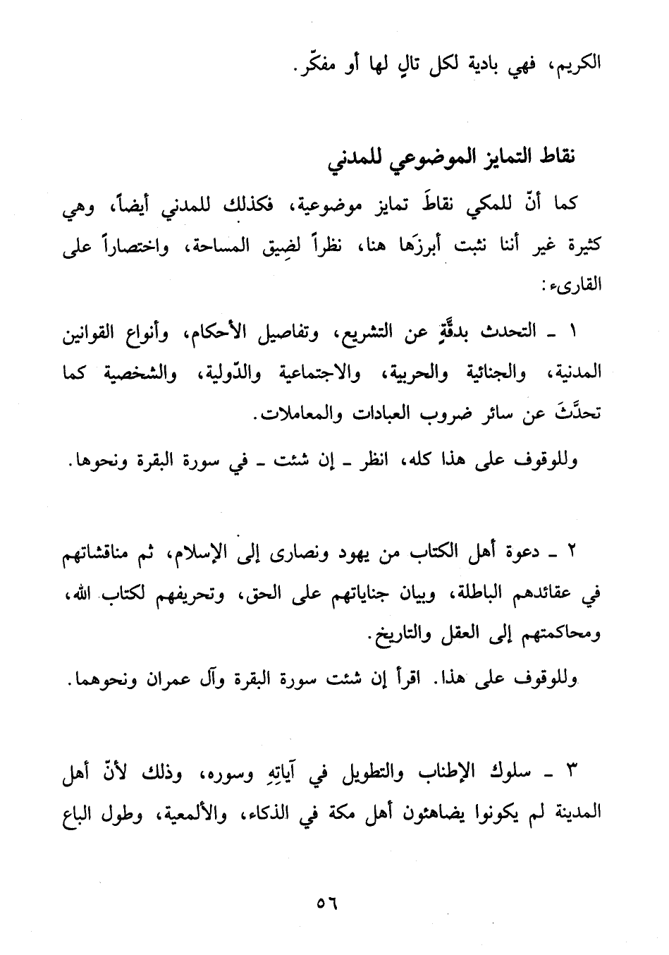 كما أنّ للمكي نقاط تمايز موضوعية، فكذلك للمدني أيضا، وهي كثيرة غير أننا نثبت أبرزها هنا، نظرا لضيق المساحة، واختصارا على القارئ: