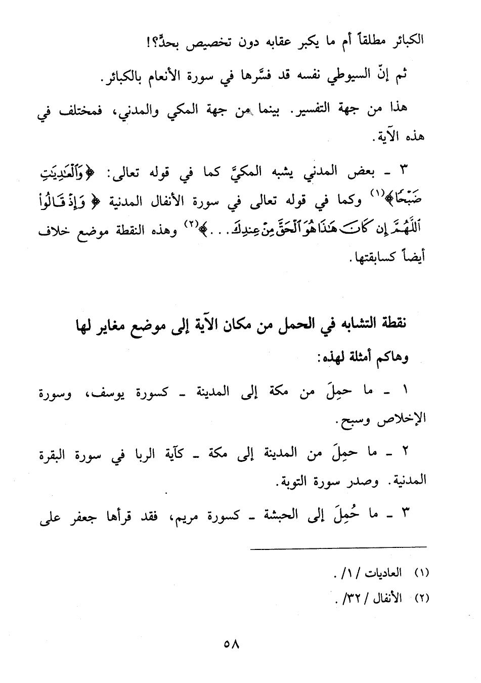 3 - بعض المدني يشبه المكيّ كما في قوله تعالى: وَالْعادِياتِ ضَبْحاً (¬1) وكما في قوله تعالى في سورة الأنفال المدنية وَإِذْ قالُوا اللَّهُمَّ إِنْ كانَ هذا هُوَ الْحَقَّ مِنْ عِنْدِكَ ... (¬2) وهذه النقطة موضع خلاف أيضا كسابقتها.