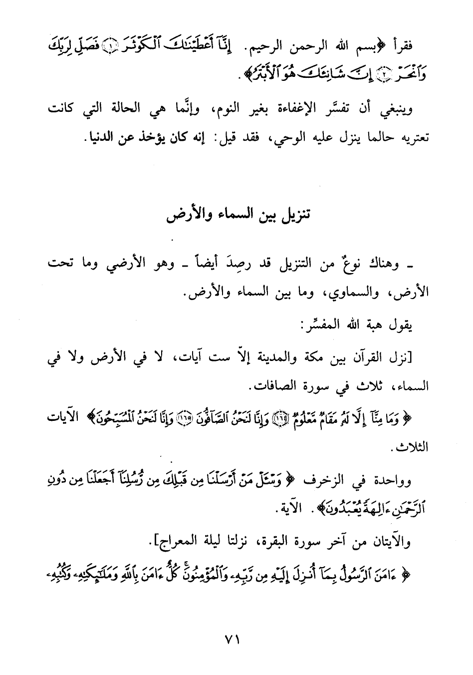 [نزل القرآن بين مكة والمدينة إلّا ست آيات، لا في الأرض ولا في السماء، ثلاث في سورة الصافات.
