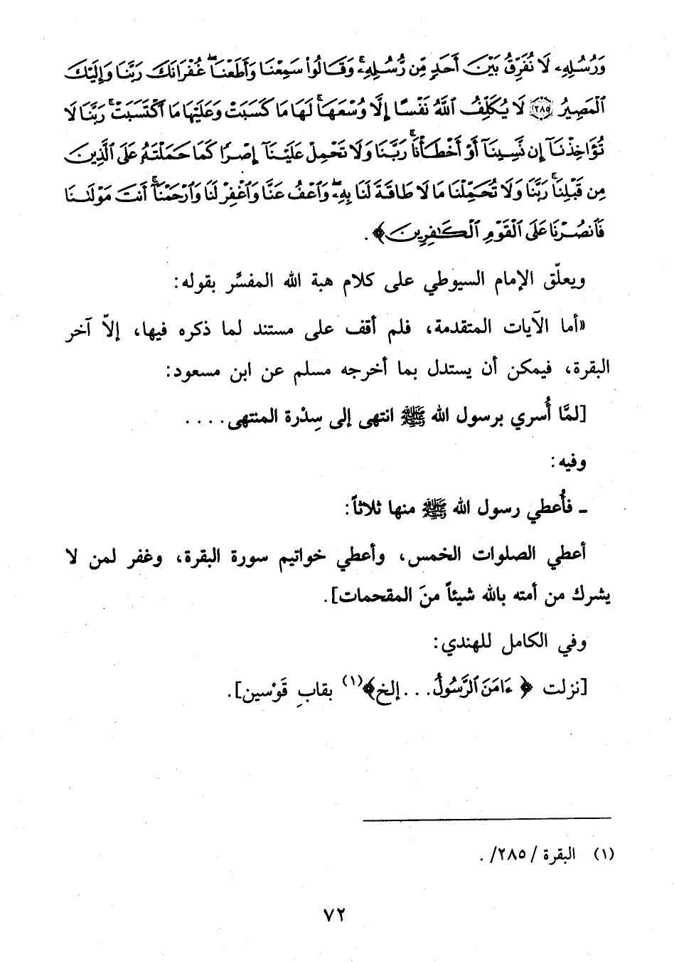 وَرُسُلِهِ لا نُفَرِّقُ بَيْنَ أَحَدٍ مِنْ رُسُلِهِ وَقالُوا سَمِعْنا وَأَطَعْنا غُفْرانَكَ رَبَّنا وَإِلَيْكَ الْمَصِيرُ (285) لا يُكَلِّفُ اللَّهُ نَفْساً إِلَّا وُسْعَها لَها ما كَسَبَتْ وَعَلَيْها مَا اكْتَسَبَتْ رَبَّنا لا تُؤاخِذْنا إِنْ نَسِينا أَوْ أَخْطَأْنا رَبَّنا وَلا تَحْمِلْ عَلَيْنا إِصْراً كَما حَمَلْتَهُ عَلَى الَّذِينَ مِنْ قَبْلِنا رَبَّنا وَلا تُحَمِّلْنا ما لا طاقَةَ لَنا بِهِ وَاعْفُ عَنَّا وَاغْفِرْ لَنا وَارْحَمْنا أَنْتَ مَوْلانا فَانْصُرْنا عَلَى الْقَوْمِ الْكافِرِينَ.